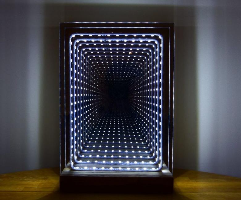 Une fois les LED allumées, leur lumière se reflète sur le métal et le miroir, créant ainsi un couloir lumineux sans fin.