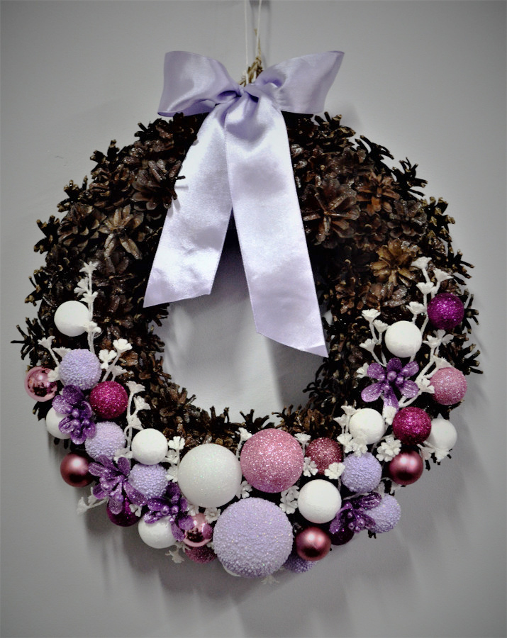 Dans ce cas, vous faites une couronne à partir de cônes uniquement. Pour cela, les cônes sont collés sur le socle, en commençant par les plus gros. Remplissez le milieu avec des éléments plus petits.