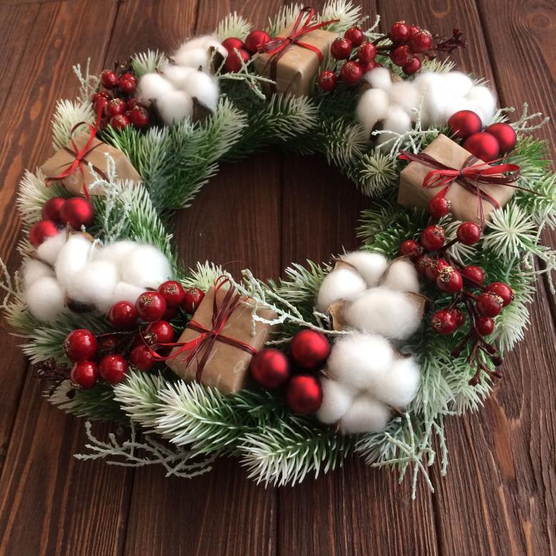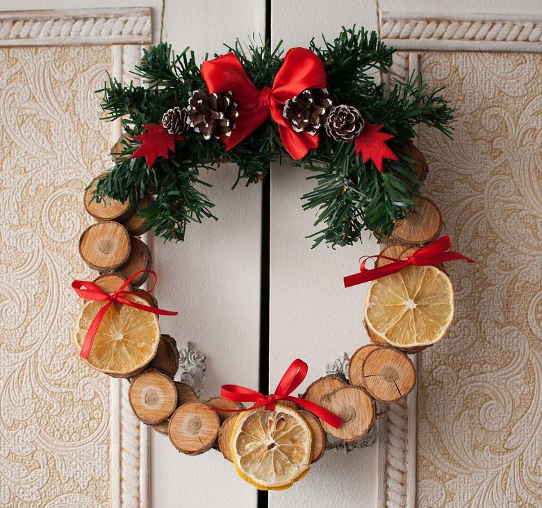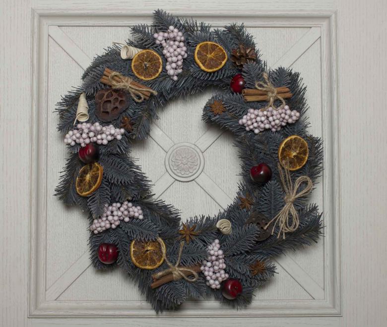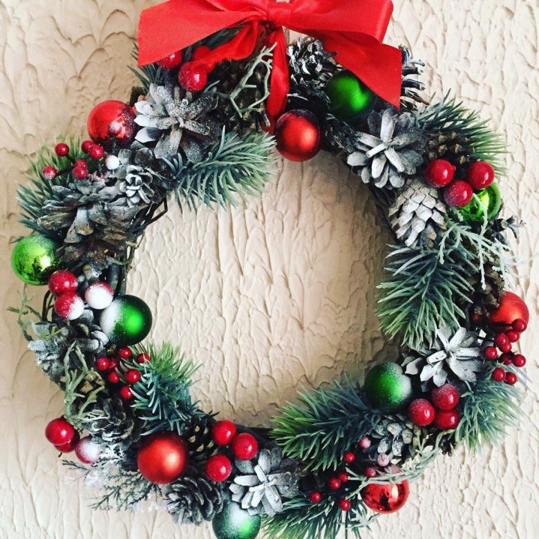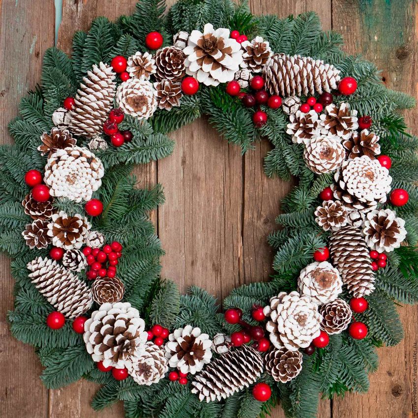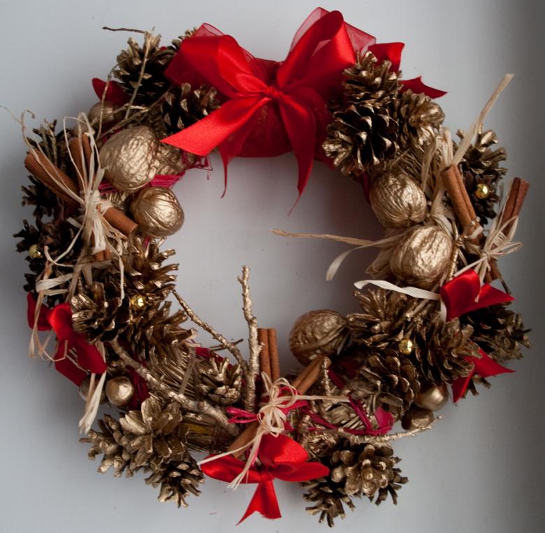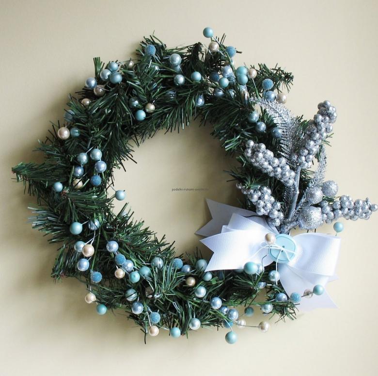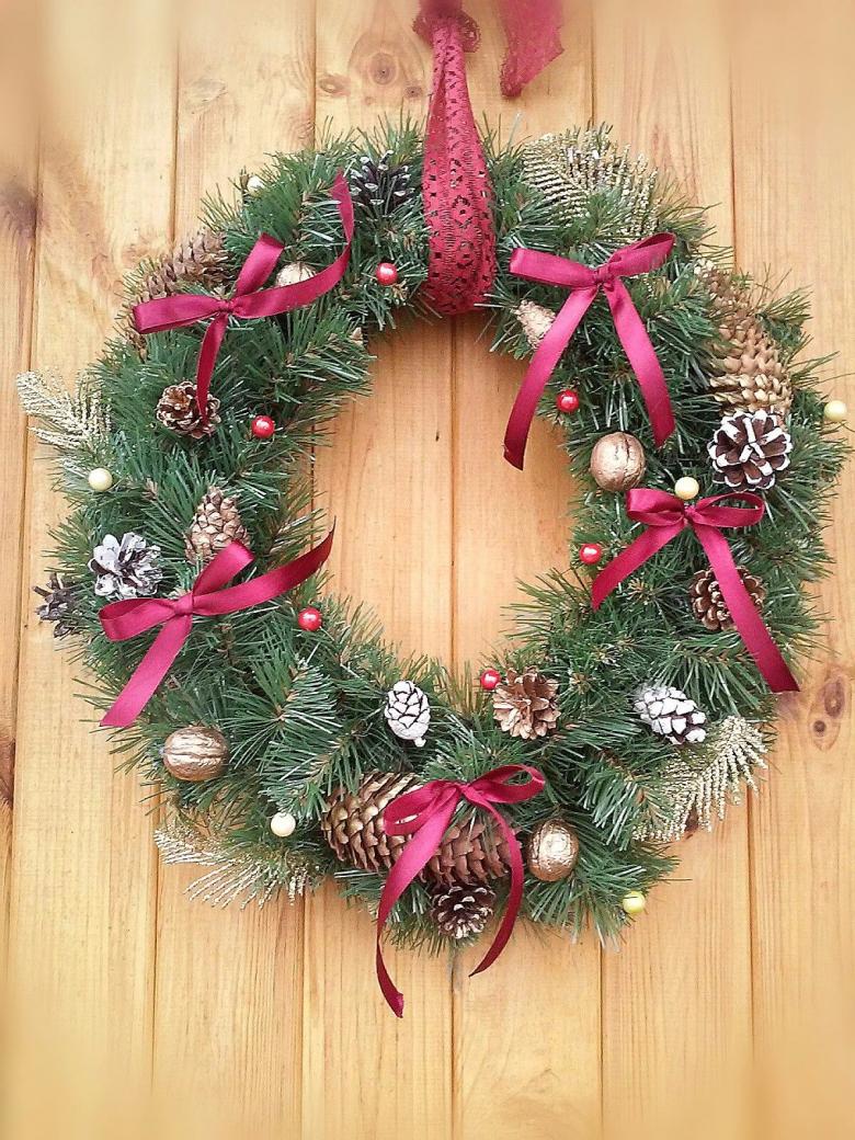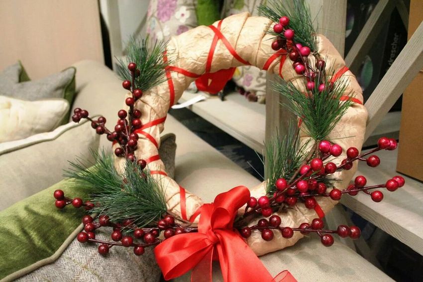 La couronne terminée peut être légèrement embellie avec un ruban écarlate et laissée à sécher, après quoi vous pouvez la suspendre en toute sécurité comme un attribut de la fête à venir.