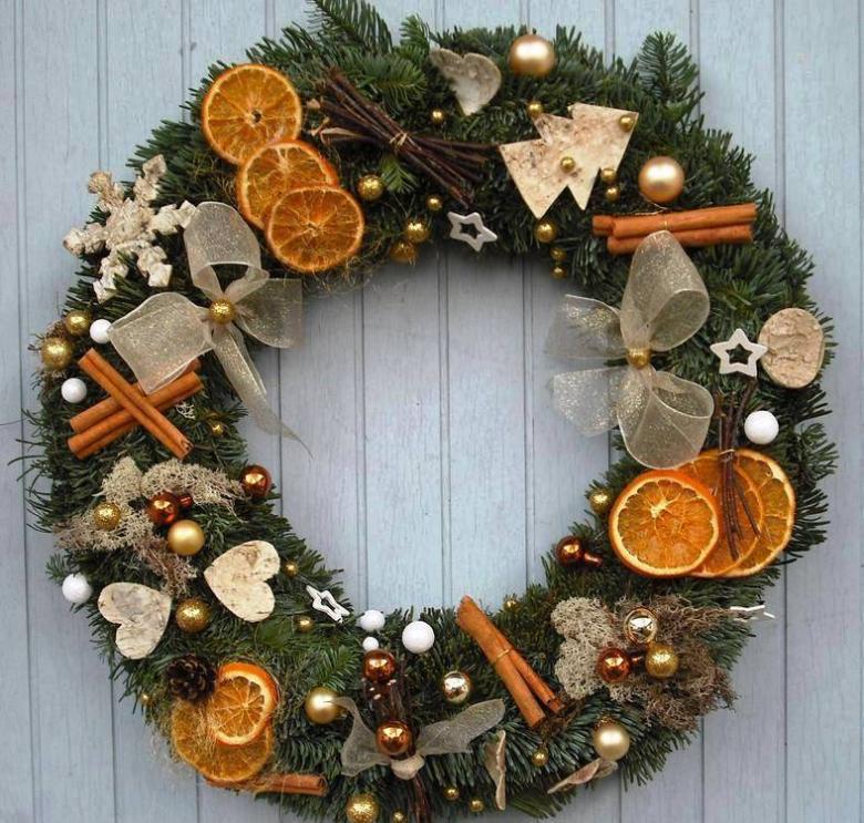 Presque tout peut être utilisé pour tisser une couronne. Certaines personnes créatives utilisent même à cette fin de la toile de jute unie ou du papier coloré, des fleurs artificielles, des mandarines et des bâtons de cannelle.