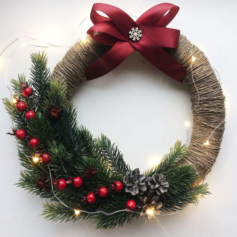 Si la création semble trop ennuyeuse, vous pouvez y mettre un peu de variété en utilisant une guirlande. Des lumières scintillantes ne manqueront pas de mettre la couronne dans une ambiance festive.