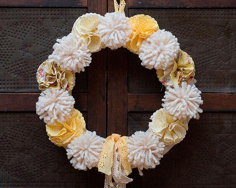 Vous pouvez faire une couronne inhabituelle avec des pompons. Il suffit de les attacher à un filet de construction que vous découpez à l'aide d'un modèle. Terminez en attachant l'objet artisanal à un cadre et en le suspendant.