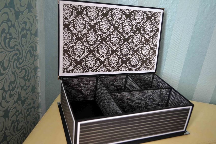 Recouvrez la grande boîte de papier. Faites de même avec les petites boîtes. Placez ensuite toutes les petites boîtes au bas de la grande boîte et collez-les ensemble. Ajoutez des décorations supplémentaires avec des rubans ou des strass.