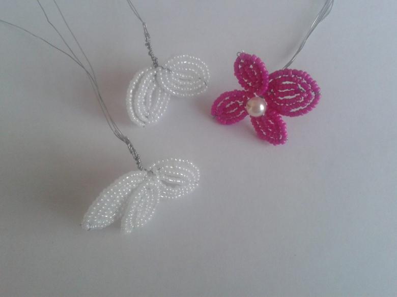 - Une perle est posée sur le fil des deux pétales et cachée au milieu entre les pétales.