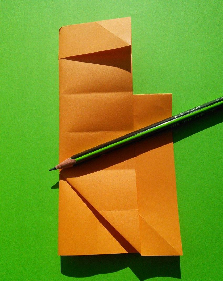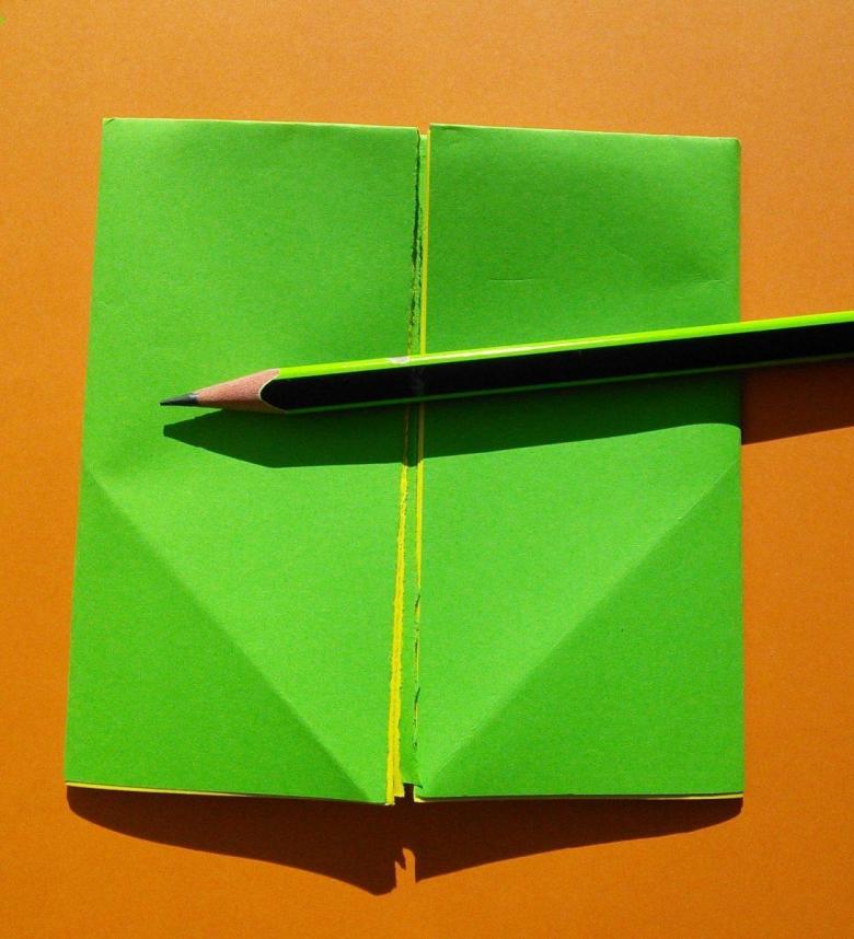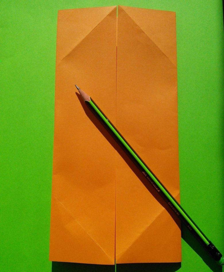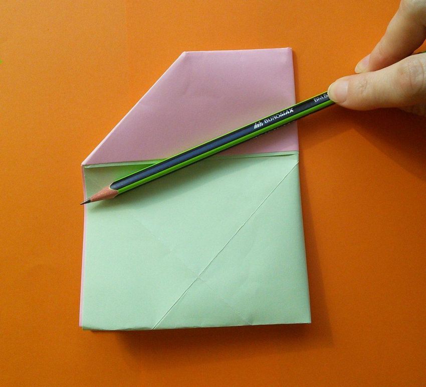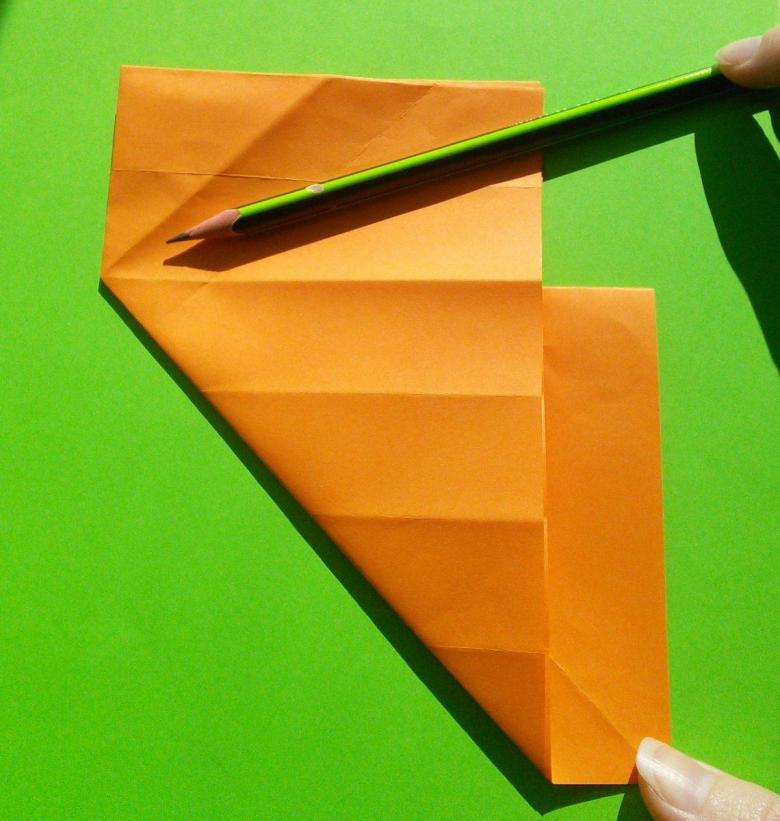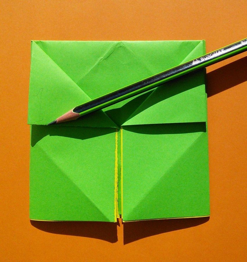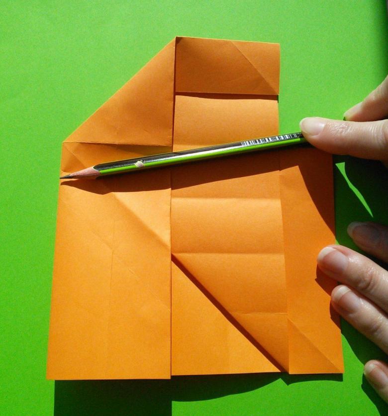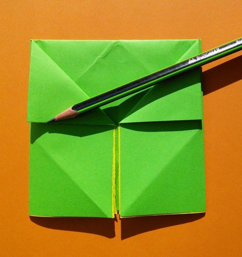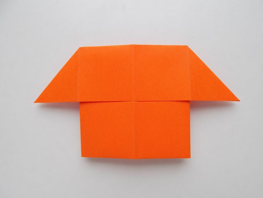 Après avoir fait deux plis vers le milieu de la pièce, et les bords sont repliés. Le coin doit être soigneusement replié pour créer une poche, qui doit être redressée du bout des doigts. De l'autre côté faites les mêmes manipulations, avec une attention particulière au toit, il doit être symétrique.