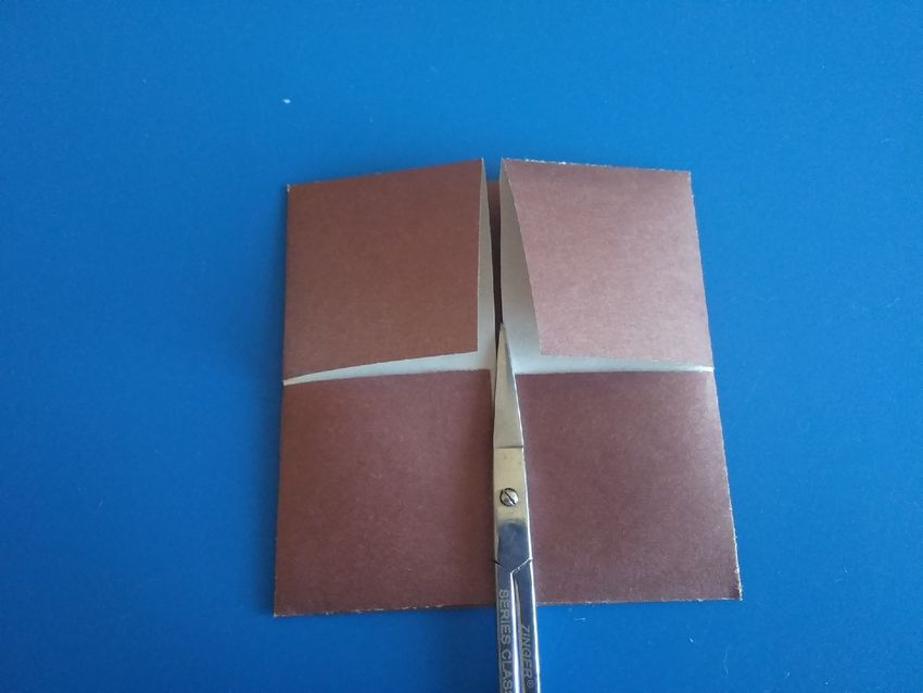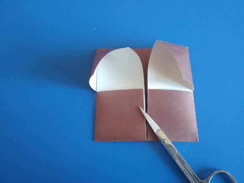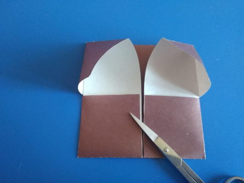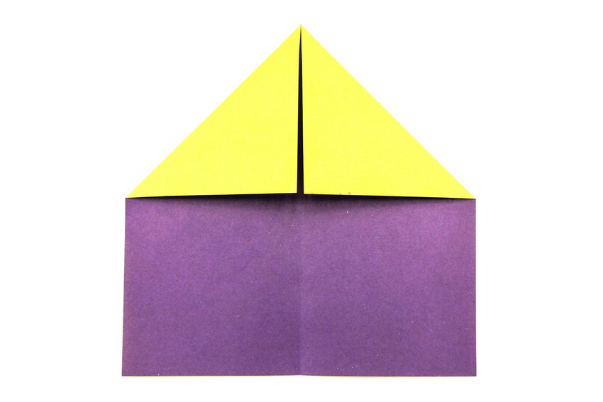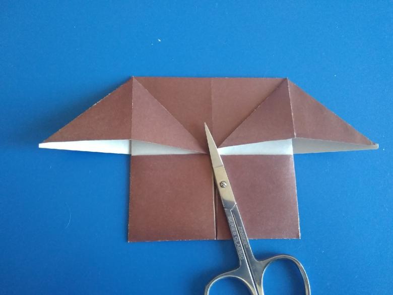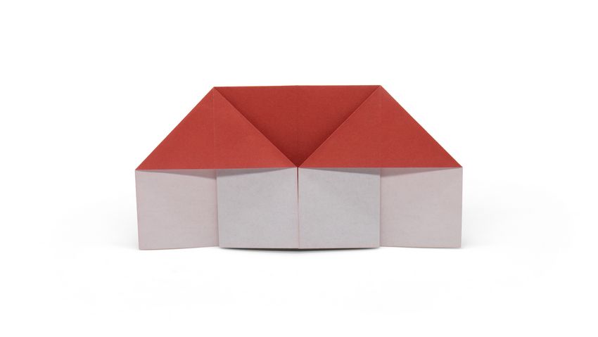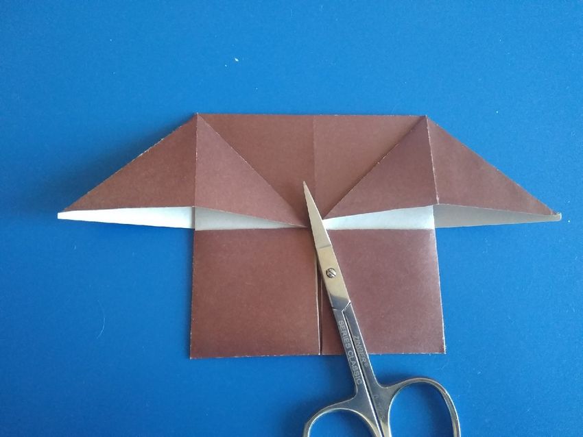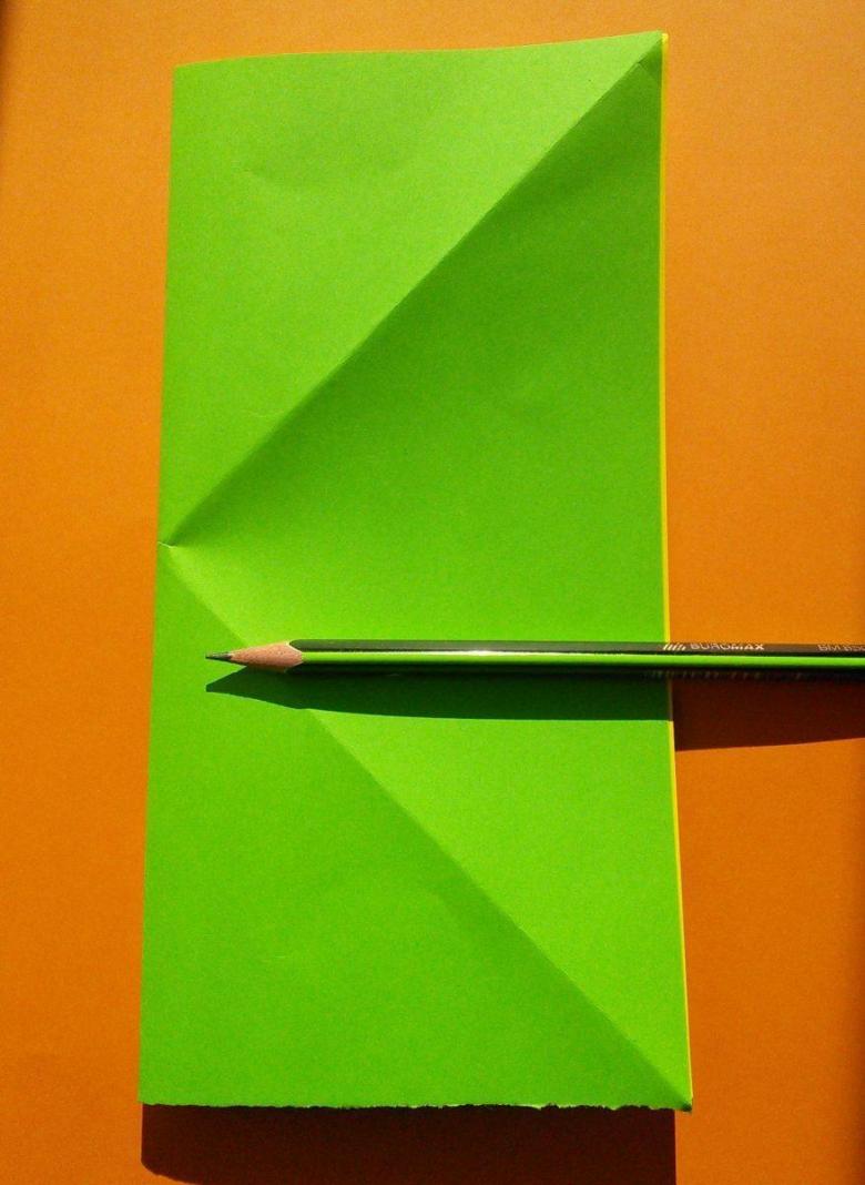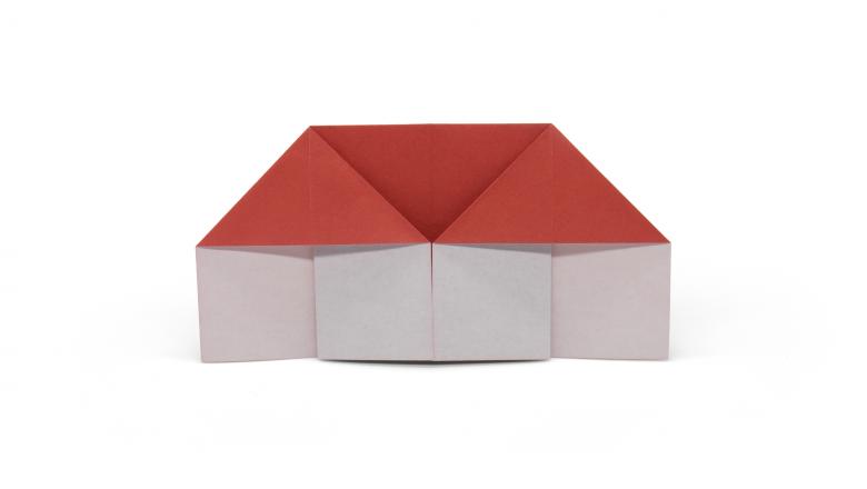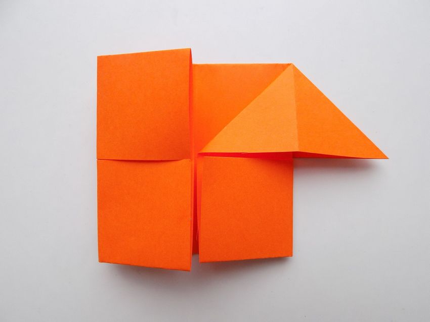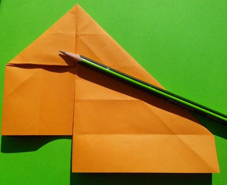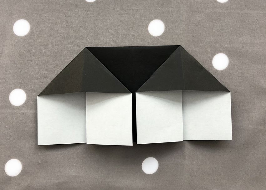 Après avoir fait deux plis vers le milieu de la pièce, et les bords sont repliés. Le coin doit être soigneusement replié pour créer une poche, qui doit être redressée du bout des doigts. De l'autre côté faites les mêmes manipulations, avec une attention particulière au toit, il doit être symétrique.
