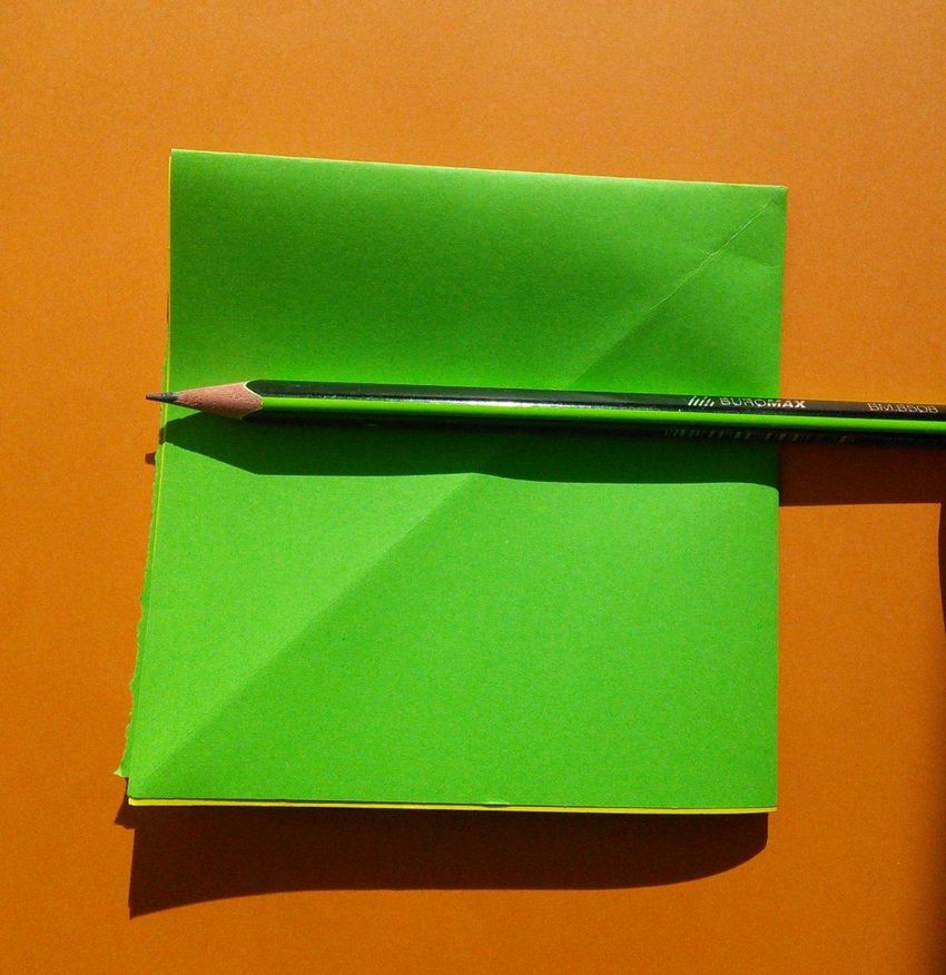 Les débutants apprécieront ce modèle et se débrouilleront assez facilement. Une simple maison en papier origami pour enfants peut être réalisée même par le plus jeune membre de la famille, si les parents lui indiquent l'algorithme d'action. Il faut prendre une feuille de papier carrée et la plier en deux, puis répéter la procédure à nouveau.