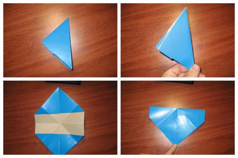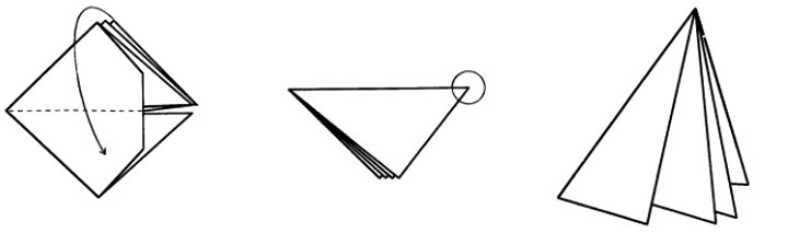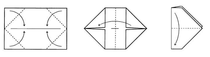 - Chaque coin de la feuille est plié avec la vallée vers le centre. Roulez la vallée de façon à ce que les coins pliés soient à l'intérieur. Pressez bien toutes les lignes de pliage avec vos doigts.