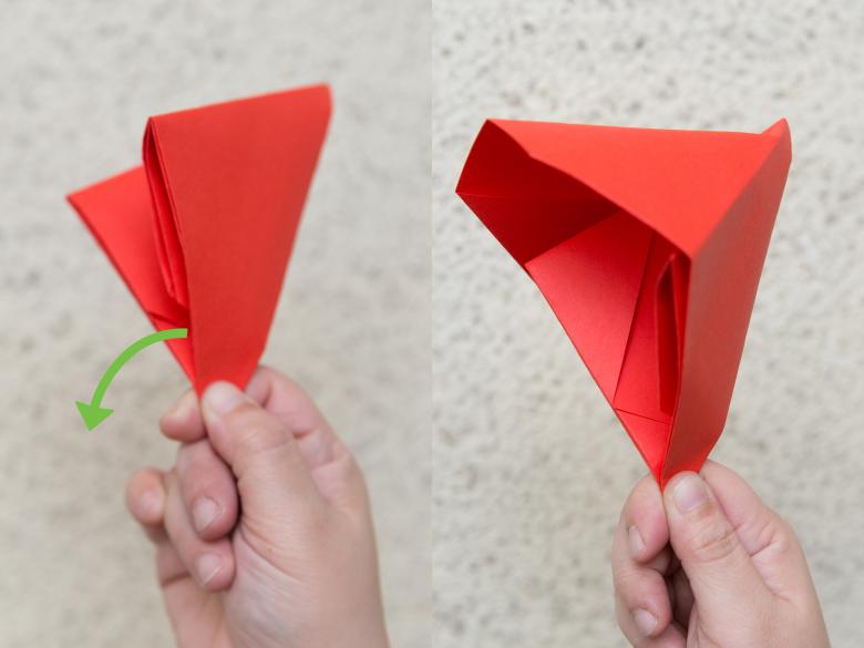 - Pliez le carré en triangle. Pour faire un bruit fort, aplatissez-le bien et appuyez sur les côtés pour libérer l'air. Pour remonter le clapet, répétez l'opération avec les poches (point 4).