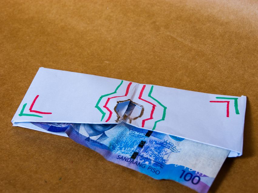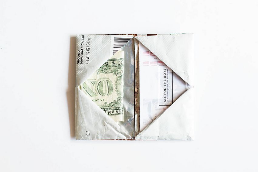 - Découpez quatre morceaux rectangulaires de carton légèrement plus grands que les billets de banque.