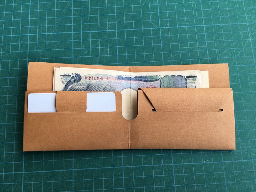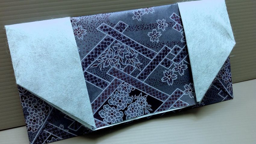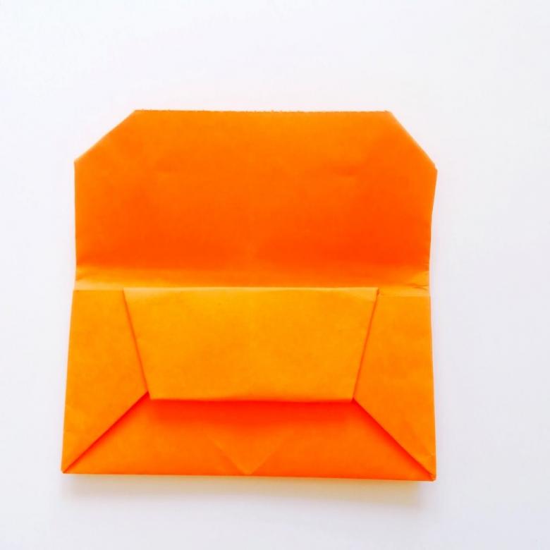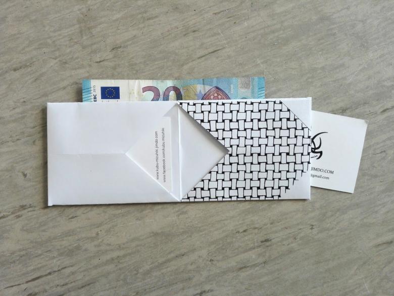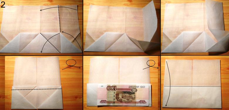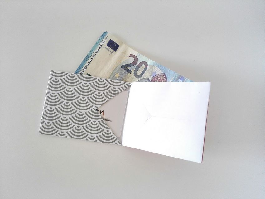 - Pliez les bandes d'oreille ainsi obtenues vers l'intérieur et le centre, formant ainsi un compartiment pour les billets de banque.