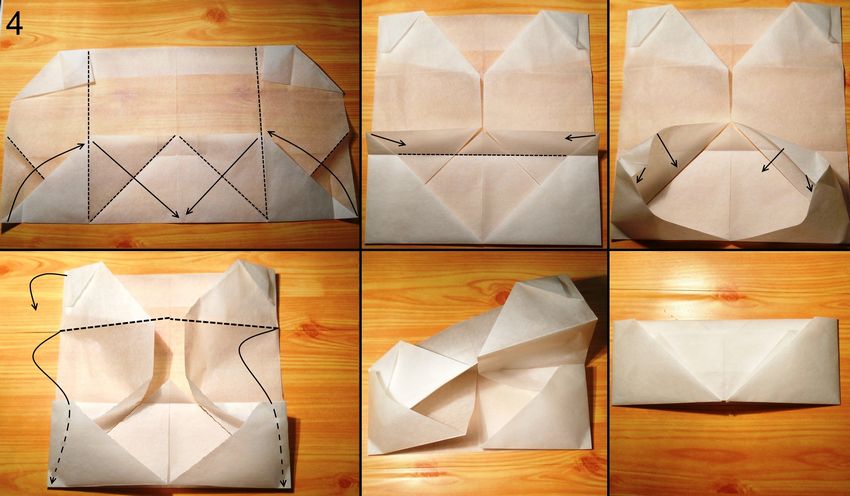 Le sac à main en origami de type enveloppe est considéré comme le plus facile à réaliser. Pour le créer, vous aurez besoin d'une feuille de format A4 / A5. Comment le faire :