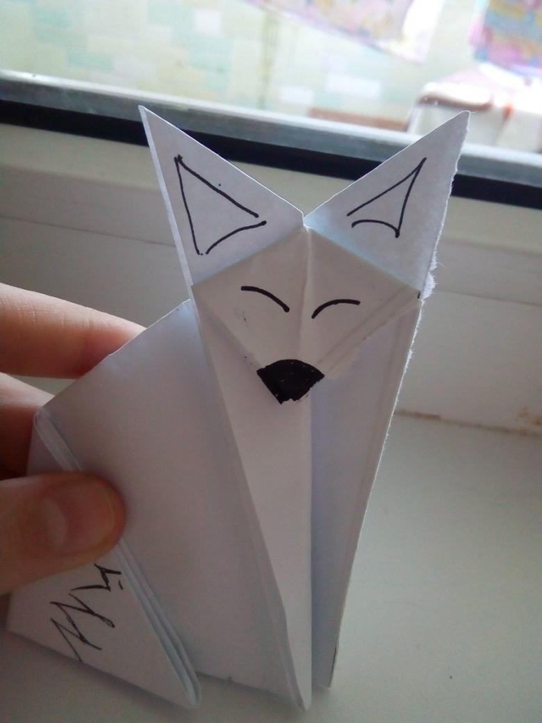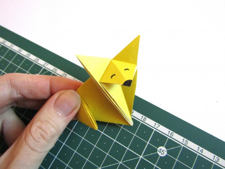 À ce stade, vous pouvez voir comment les côtés forment les oreilles d'un renard, donc le processus de formation d'un faux est réussi. Il ne reste plus qu'à peindre la figurine et à la rendre stable. Pour que le modèle garde l'équilibre, il faut plier la queue à l'intérieur. Tu peux commencer à le décorer, dessiner des yeux, une bouche, un nez et des moustaches, ajouter ce que tu veux, il n'est pas interdit d'expérimenter.