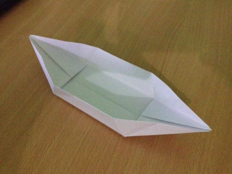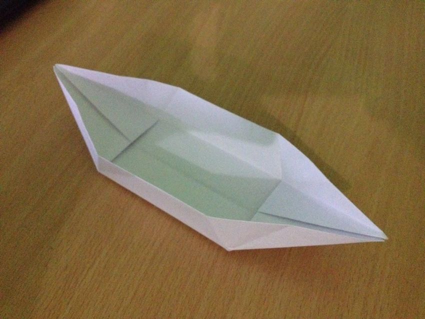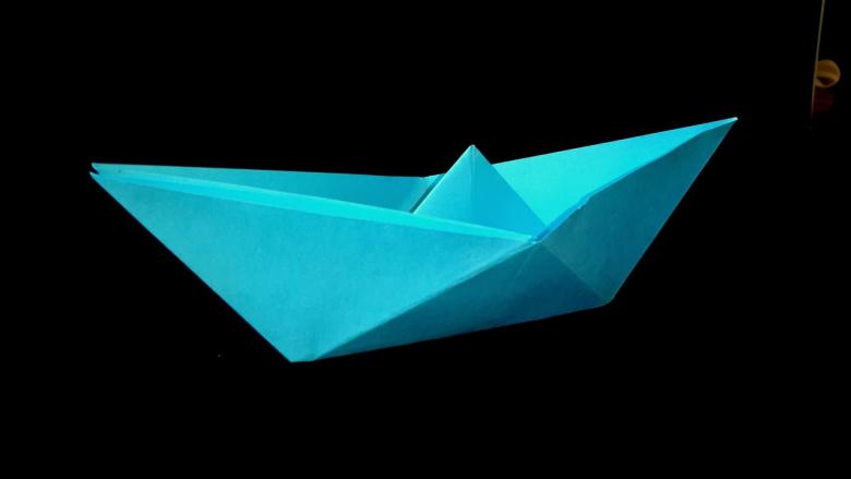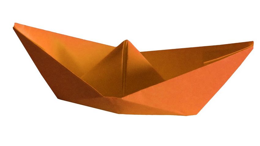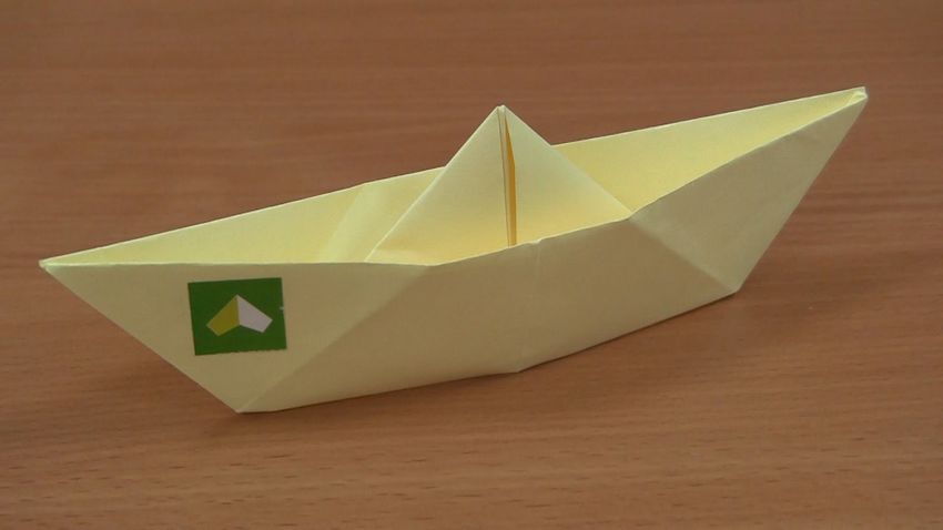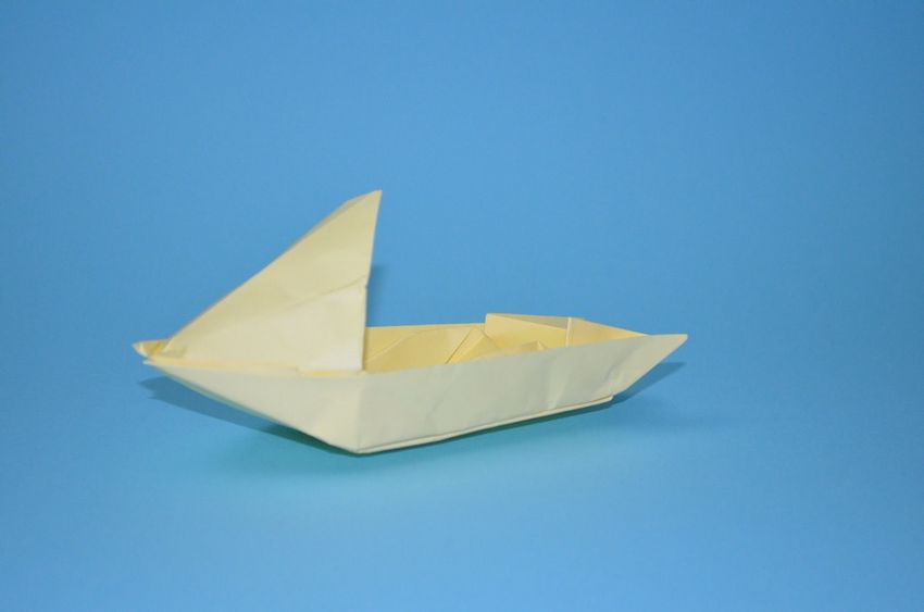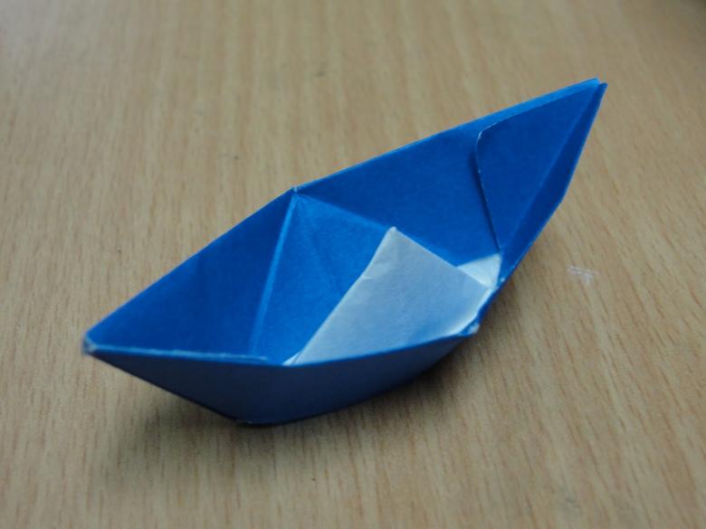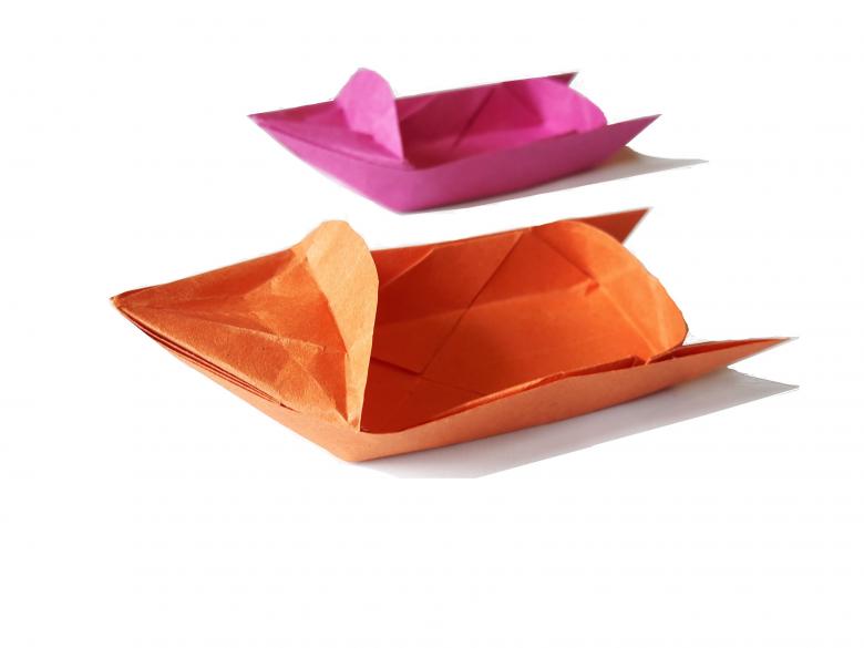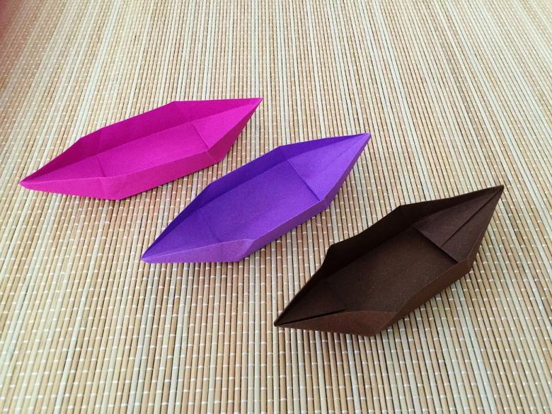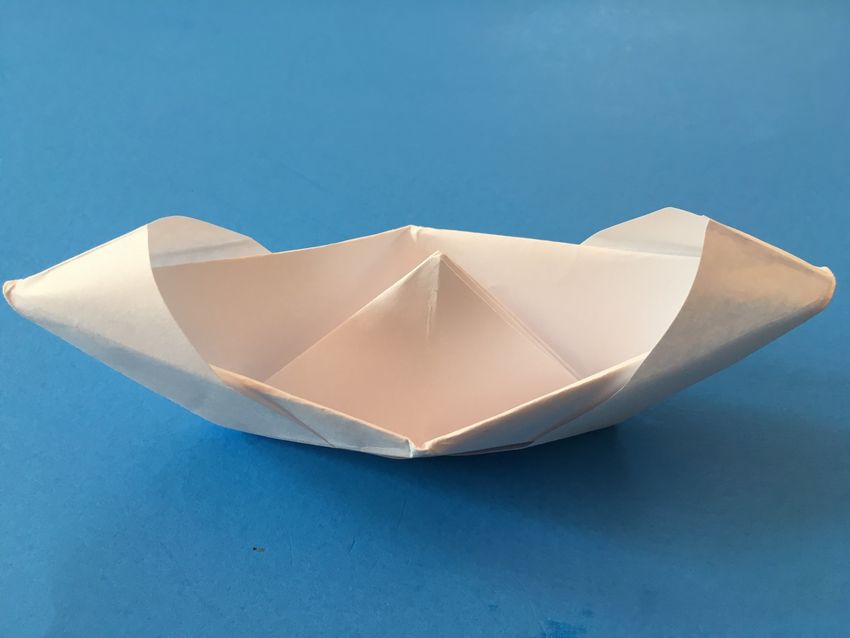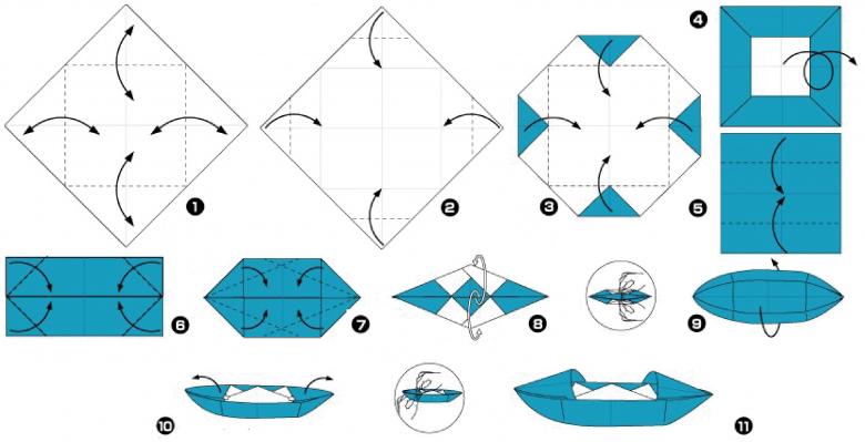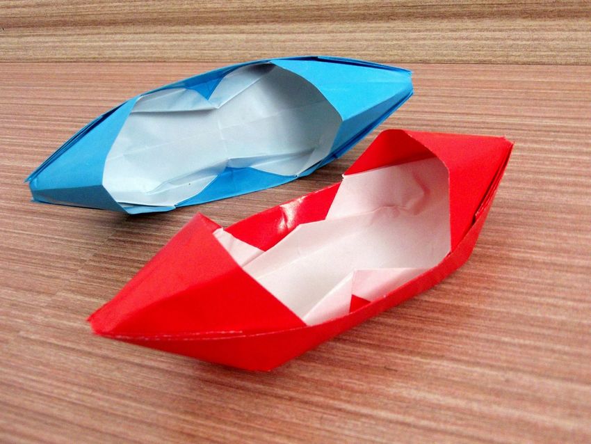 L'origami "bateau plat" est intéressant car on peut y placer de petits jouets et les envoyer en voyage en pleine mer. Une telle construction est facile à maintenir à la surface de l'eau. Algorithme d'action :