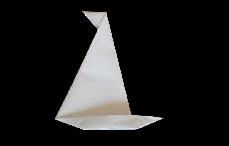 - Tournez la pièce. Prenez le coin supérieur et pliez-le en diagonale pour refléter la partie inférieure. Le bateau est prêt !