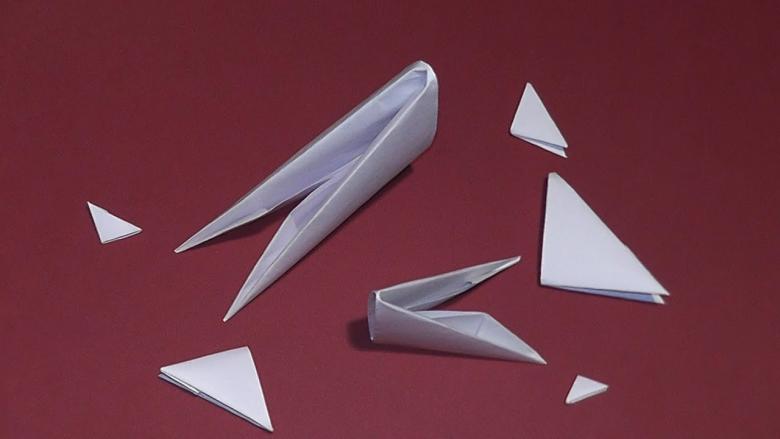 - Le deuxième triangle se plie, cachant son coin dans la "poche" résultante ;