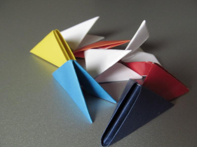 - Pliez les "ailes" ainsi obtenues de manière à ce que l'endroit où elles sont reliées soit caché sous le triangle central ;