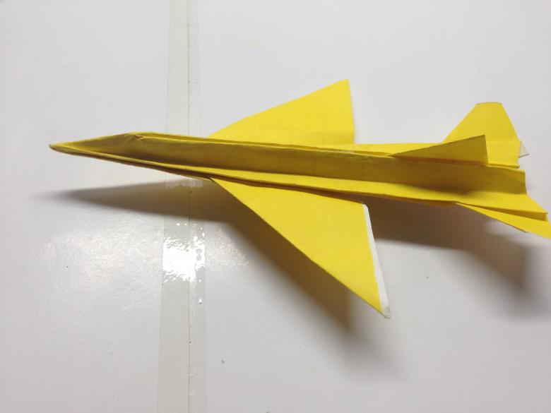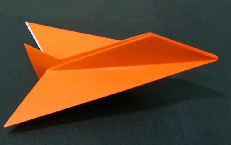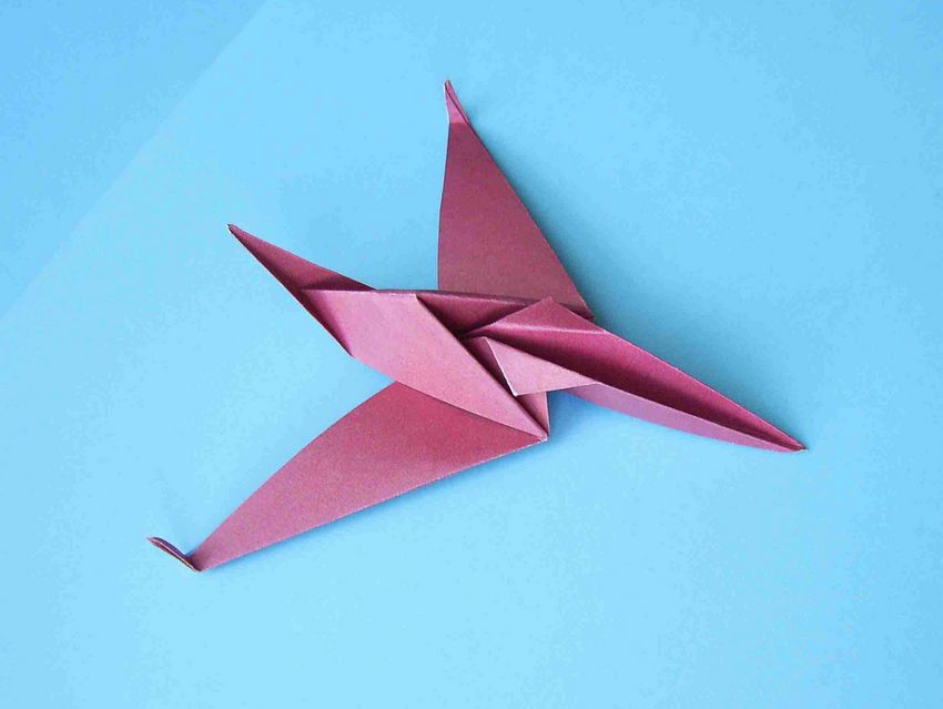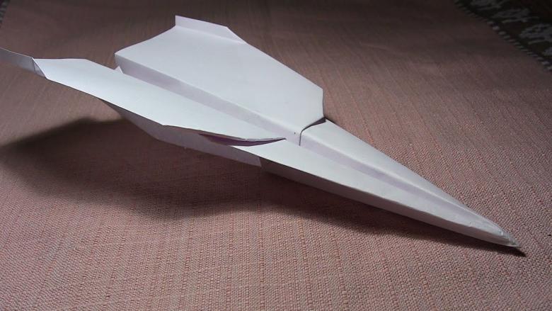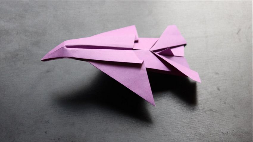 Cet "avion" origami en papier est plus complexe. D'abord, vous devez faire un gabarit avec une variété de plis marquant les côtes de l'appareil volant. Pour créer un modèle de planeur à réaction, vous aurez besoin d'une feuille carrée de papier spécial produit spécialement pour la pratique de cet art japonais.