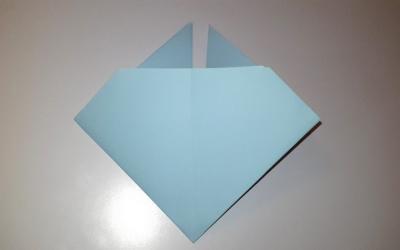 - Ramenez 2 coins vers la ligne centrale du pli et pliez en triangles. Vous devriez obtenir une figure, ressemblant à une maison avec un toit.