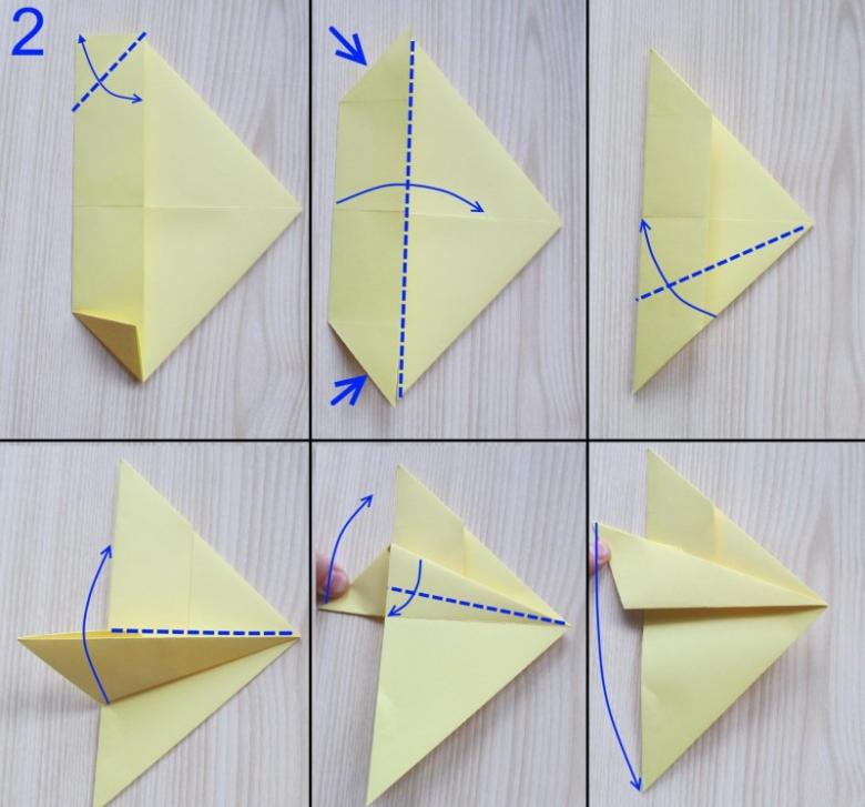 Soulevez le coin inférieur droit jusqu'au sommet de la première marque. Abaissez le coin supérieur droit - il doit rencontrer en diagonale la partie inférieure. Enroulez le "nez" pointu vers le centre et repliez son bord saillant de l'aile supérieure. Reste à plier en deux, déplier les ailes, peindre avec des rayures stylées.