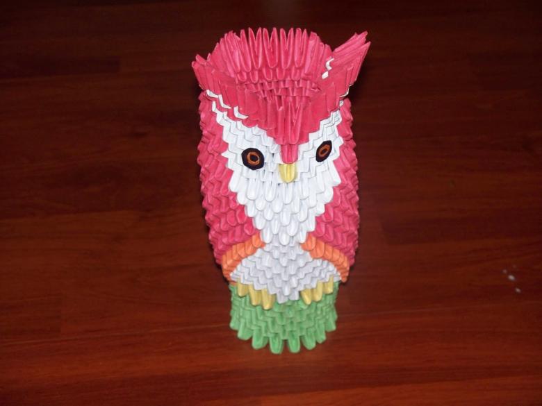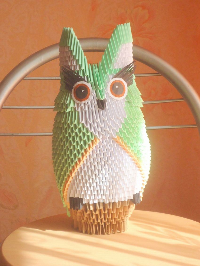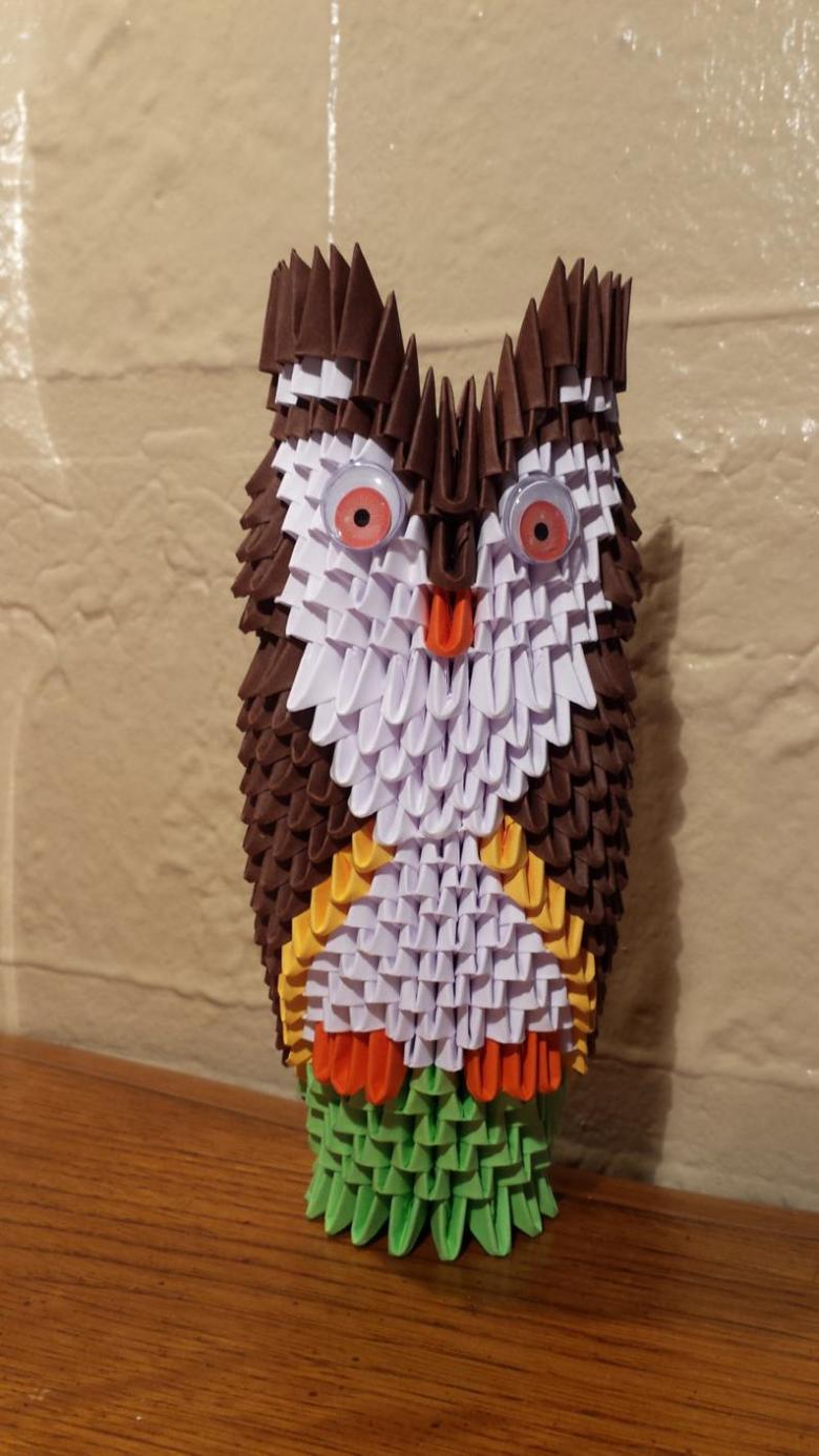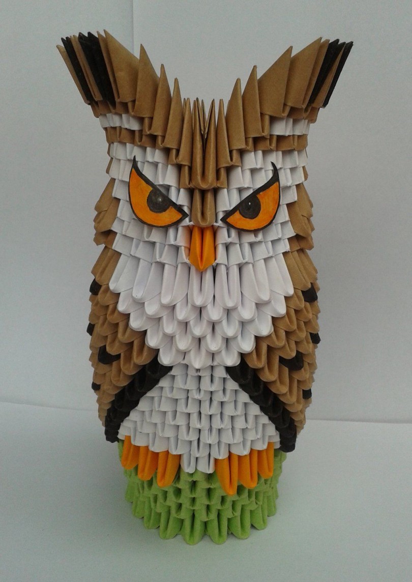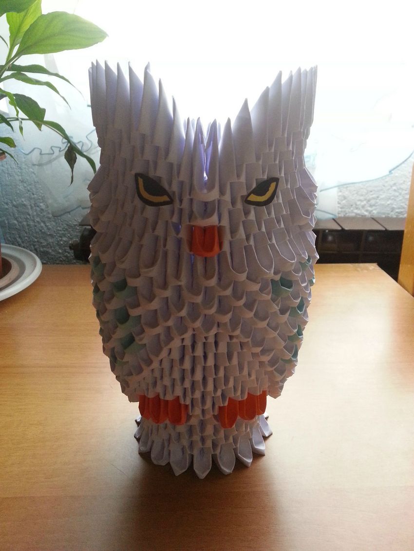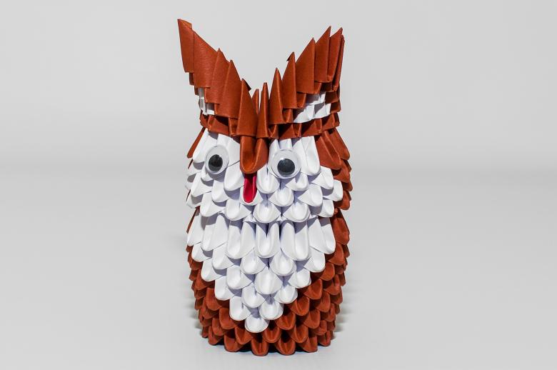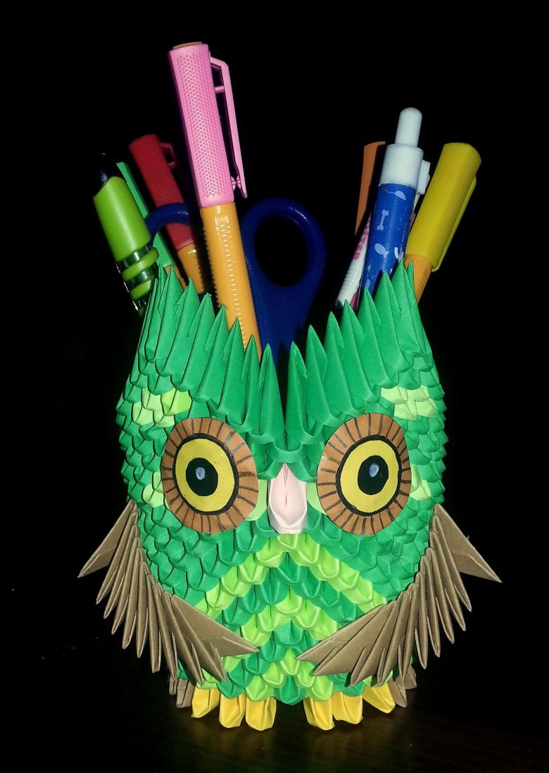 La chouette en origami finie des modules peut être utilisée comme un objet de décoration distinct ou être dotée d'un objectif fonctionnel. Parce que l'intérieur de l'engin est creux, si vous ne fermez pas les modules du haut de la tête, l'intérieur de l'engin peut être mis crayons et stylos, et si vous exécutez les modules du haut de la tête-couvercle, vous avez une boîte pour les choses légères.