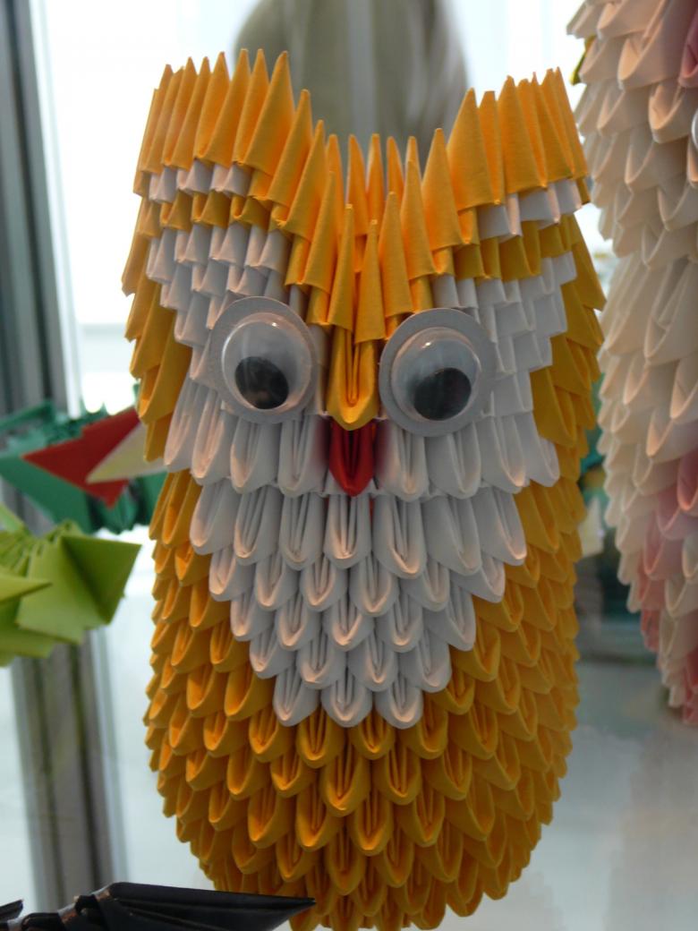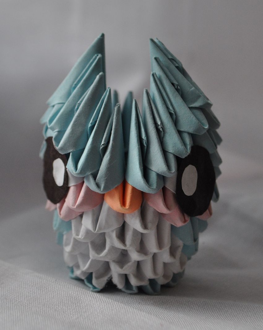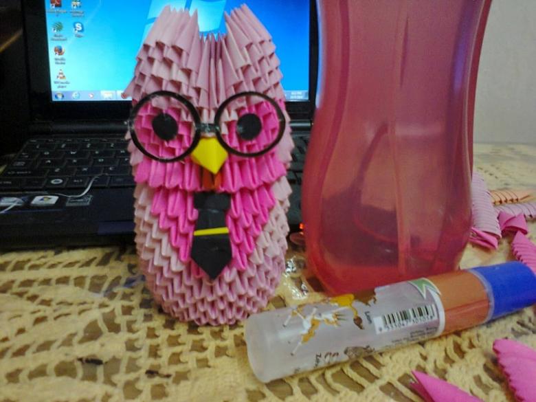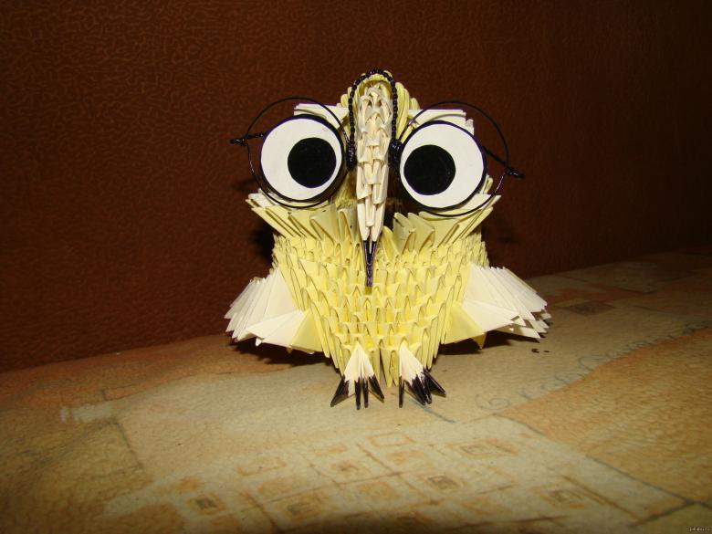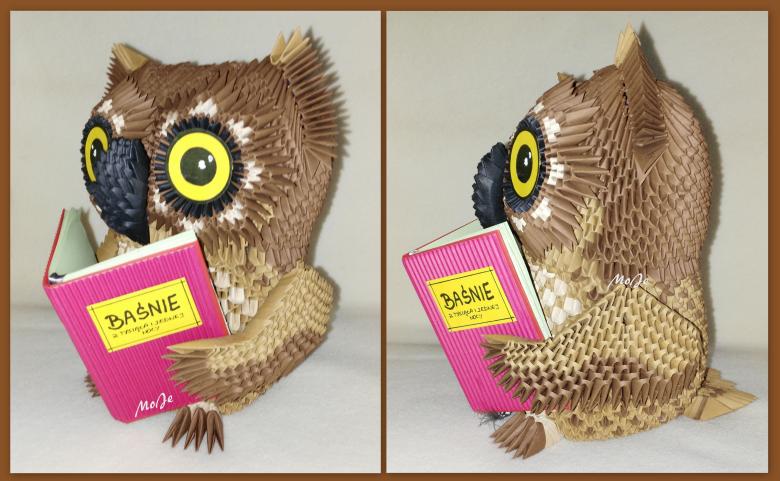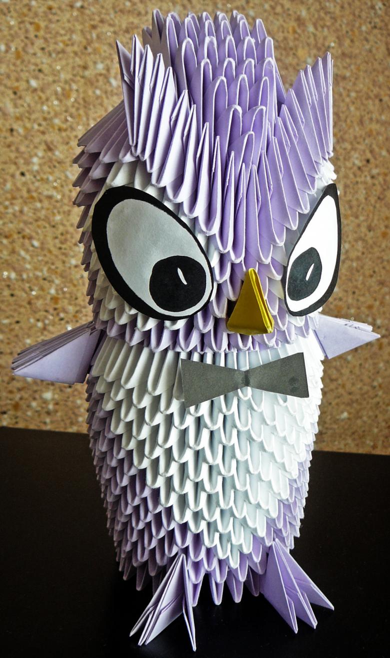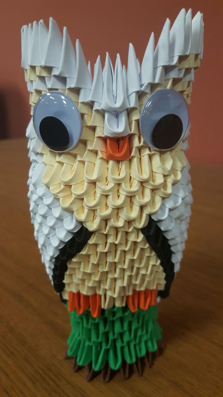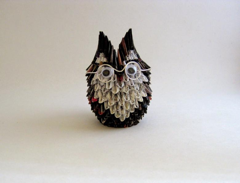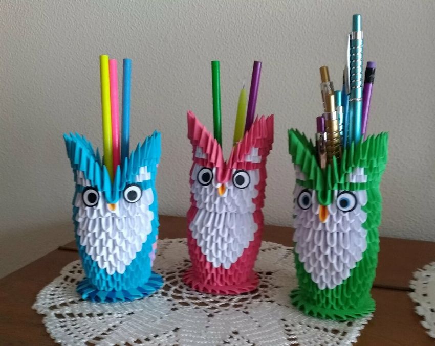 La chouette en origami finie des modules peut être utilisée comme un objet de décoration distinct ou être dotée d'un objectif fonctionnel. Parce que l'intérieur de l'engin est creux, si vous ne fermez pas les modules du haut de la tête, l'intérieur de l'engin peut être mis crayons et stylos, et si vous exécutez les modules du haut de la tête-couvercle, vous avez une boîte pour les choses légères.