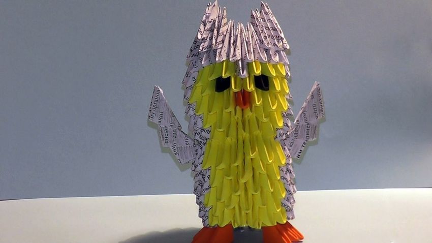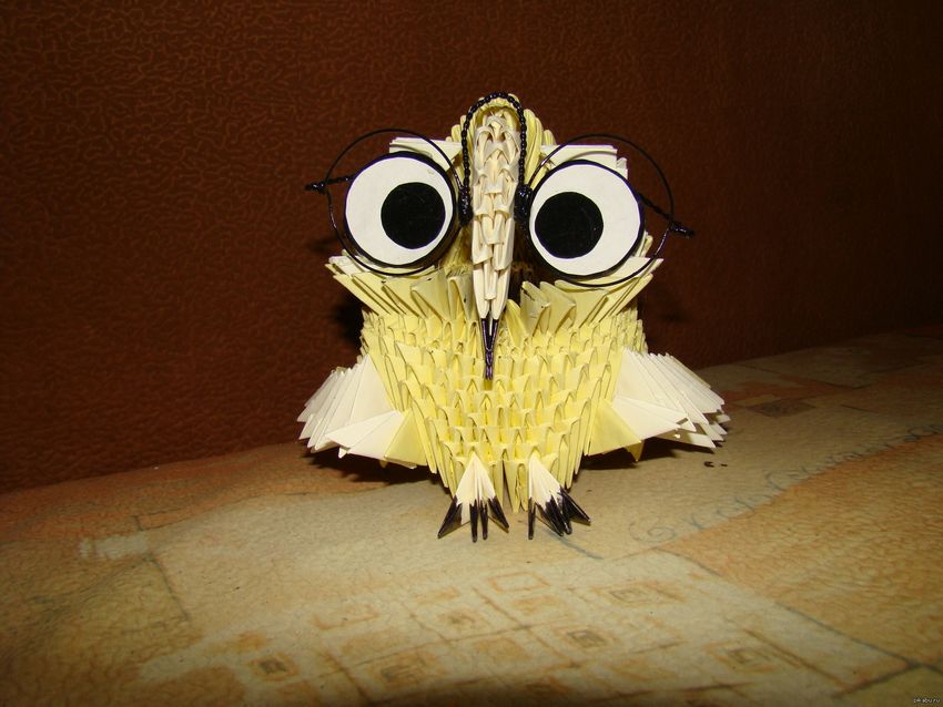 Les ailes du hibou peuvent simplement être dessinées sur l'objet fini, vous pouvez les découper dans du papier de couleur et dessiner les plumes dessus. Pour ceux qui ne sont pas fatigués de coller des modules, vous pouvez fabriquer les ailes à partir des mêmes modules. Cette méthode prendra un peu plus de temps, mais elle est la meilleure.