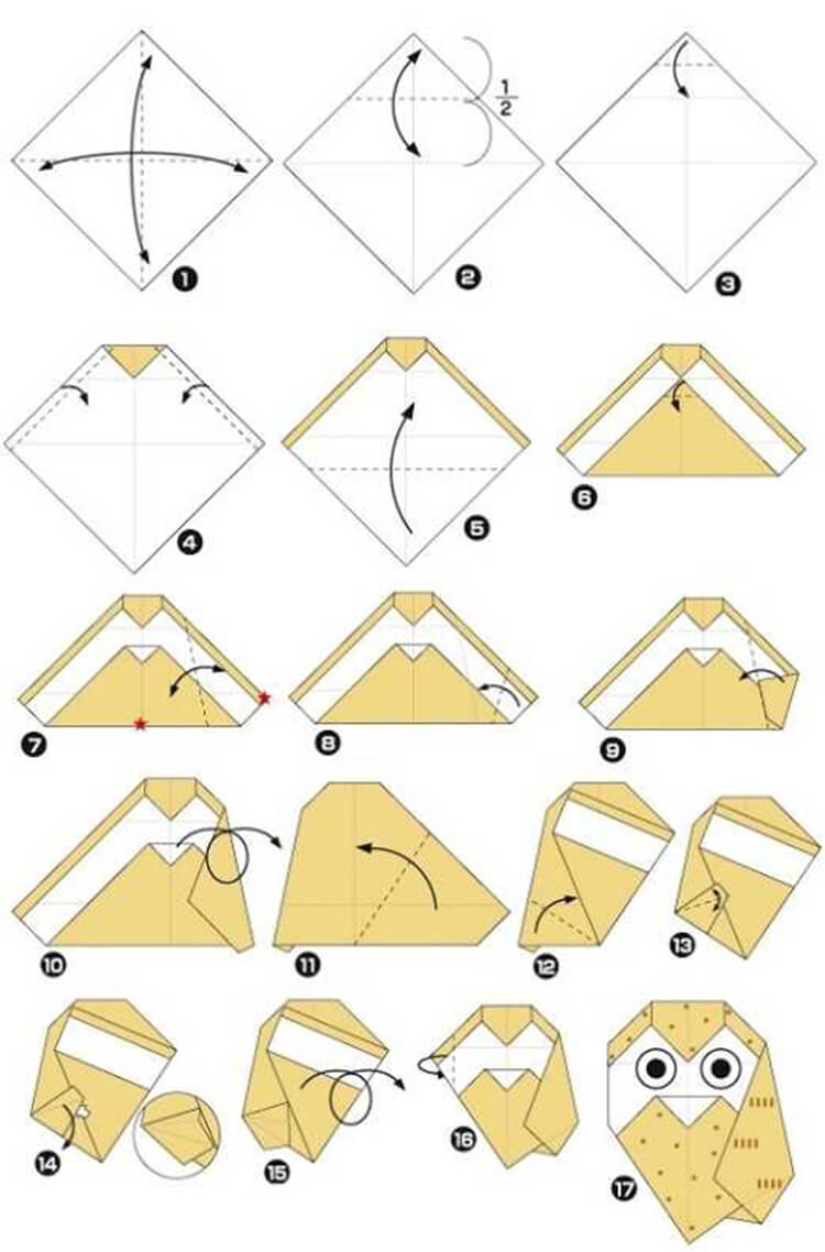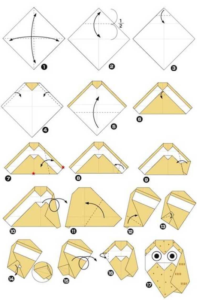 Comment savoir si un métier est compliqué avec tel ou tel schéma ? Tout d'abord, regardez le nombre d'étapes qu'il contient. S'il y en a moins de 15, il s'agit très probablement d'un schéma simple de hibou en origami pour les enfants.