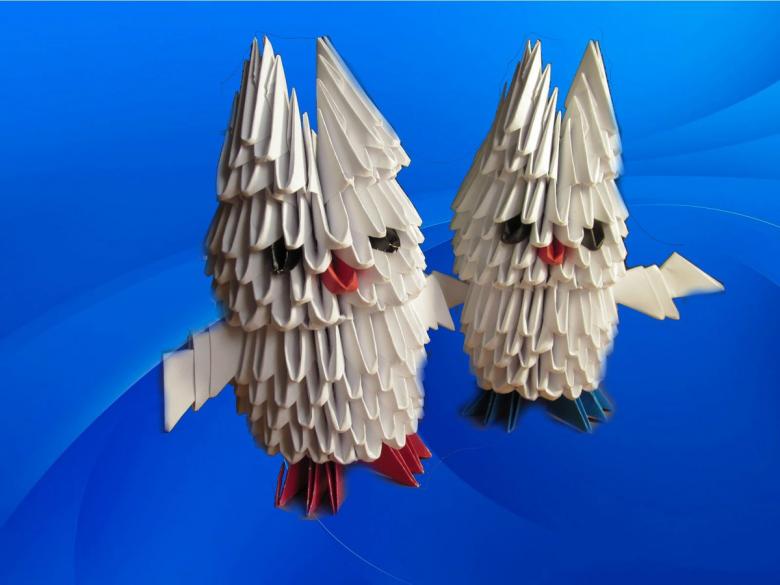 Les couleurs du papier sont données dans les instructions à titre d'exemple, vous pouvez réaliser un hibou en origami dans n'importe quelle couleur. Même un bricolage modulaire à partir de feuilles blanches de papier de bureau est très efficace.