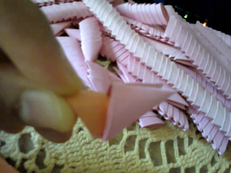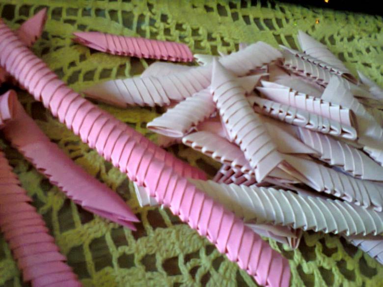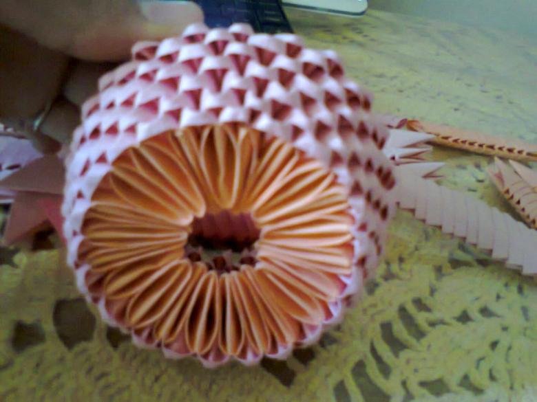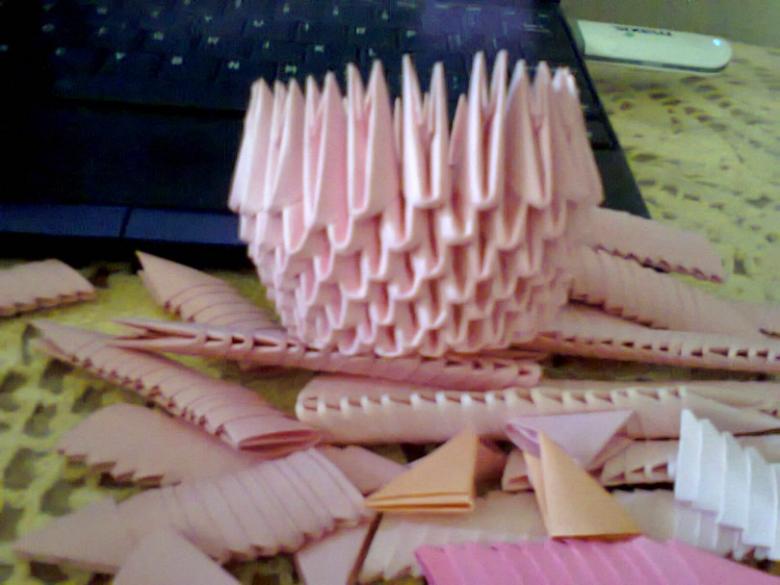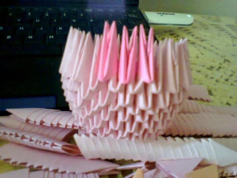 Pour réaliser l'étage inférieur du modèle, qui accueillera le dessin, prenez cinq modules dans la couleur de base et collez-les ensemble. Collez les parties qui ne s'ouvrent pas. La colle PVA peut être utilisée pour cette procédure, mais la colle thermofusible obtenue à l'aide d'un pistolet à chaud collera plus rapidement le papier dense. Chaque point d'attache doit être serré avec une pince de chancelier et la date doit bien sécher.
