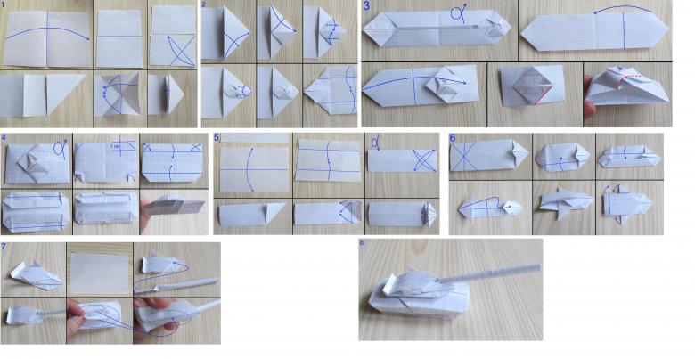 Cette section présente les instructions étape par étape pour fabriquer un char d'assaut pour enfants à partir de papier. Il s'agit d'une figure assez complexe, vous devez donc agir en suivant strictement les instructions.