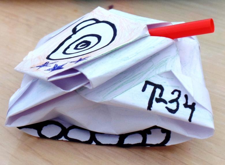 Pour le réservoir, qui est en papier blanc, il faut penser à la décoration. Une option classique serait de peindre tout le réservoir en couleur camouflage, cela fera un réservoir origami version miniaturisée de cette machine.Odin n'est pas la seule option, vous pouvez penser à quelque chose d'original : expérimenter avec les couleurs, apprendre ce que les enfants veulent, comment il voit le réservoir ou chercher des options de conception sur Internet.