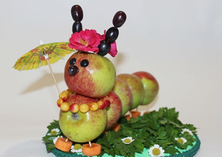 Utilisez de la pâte à modeler pour lier les pommes ensemble et former le corps de l'insecte. Un fruit est placé sur le corps jouant le rôle de la tête de la chenille. Les yeux, la bouche et le nez sont dessinés au feutre. Les "cornes" et les "pattes" de l'insecte sont en pâte à modeler.