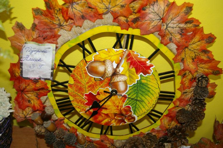 L'étape suivante consiste à placer des feuilles colorées dans les coins. Veillez à ce que les aiguilles des heures et des minutes ne touchent pas les décorations.