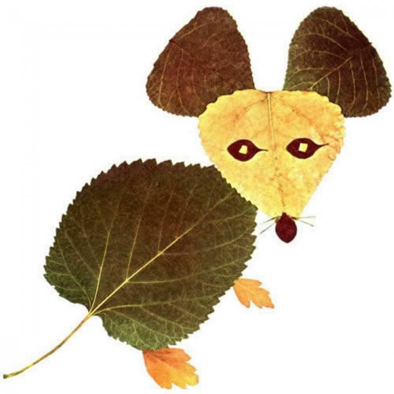 Collez une feuille brun verdâtre sur une feuille de papier : ce sera le corps de votre future souris. A l'une des extrémités de la feuille, collez une autre feuille, triangulaire, plus petite. Prenez de préférence une feuille de couleur jaune - ce sera la tête d'une mignonne petite souris. Deux feuilles, la plus petite taille, serviront d'oreilles.