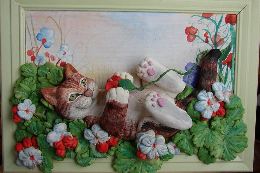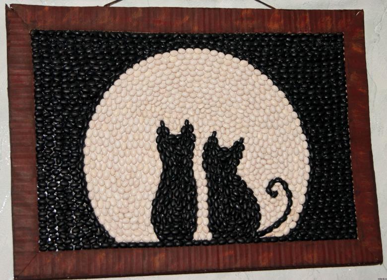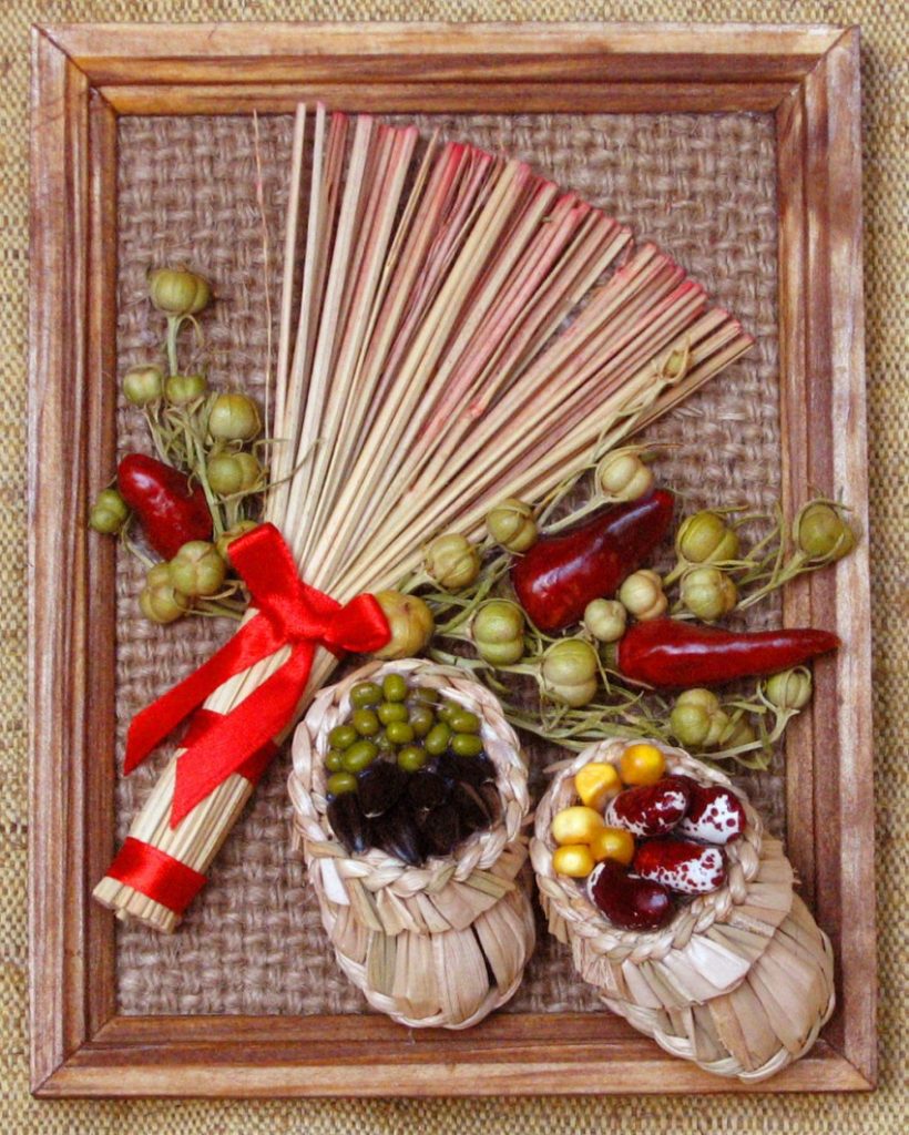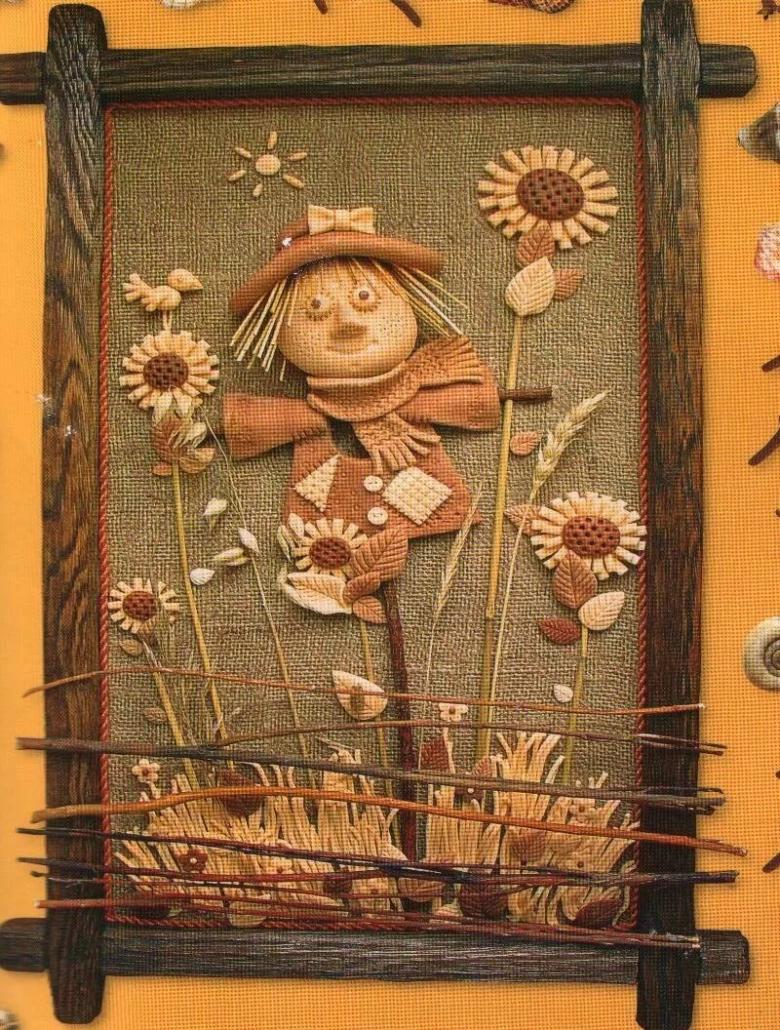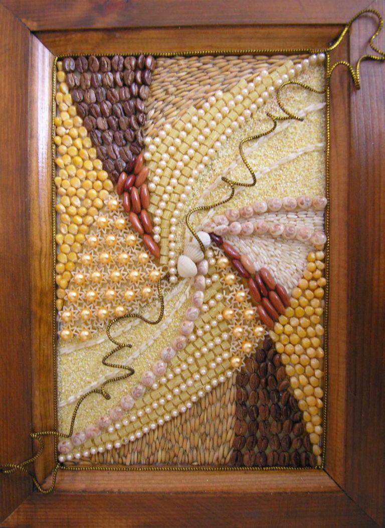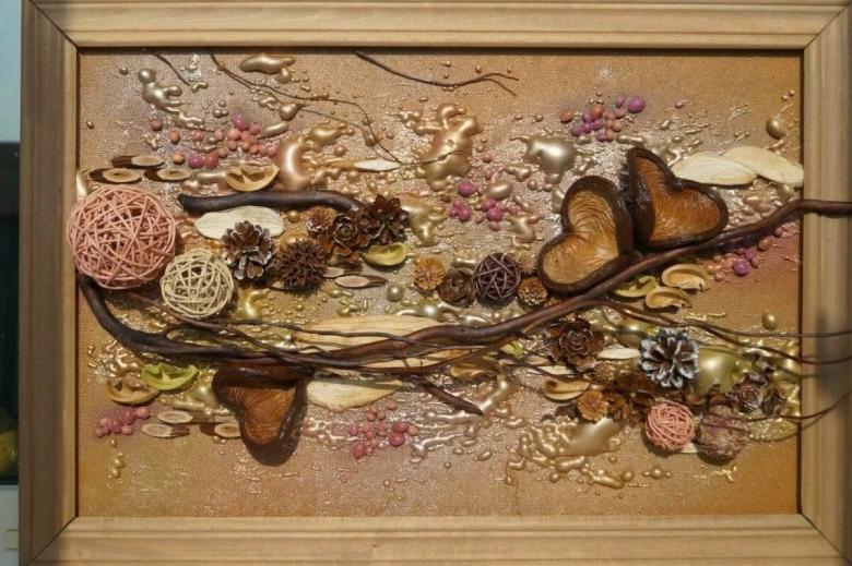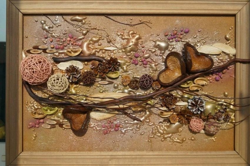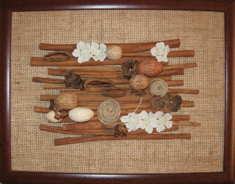 Le moyen le plus simple de créer un panneau sur le mur est la pâte à sel (les enfants à partir de 2 ans peuvent le faire), certaines céréales, le sarrasin, le millet, l'orge, et même toutes sortes de pâtes. On utilise du marc de café et des morceaux de fruits séchés, par exemple de l'orange, du clou de girofle, de la cannelle, selon l'idée, le sujet et la composition.