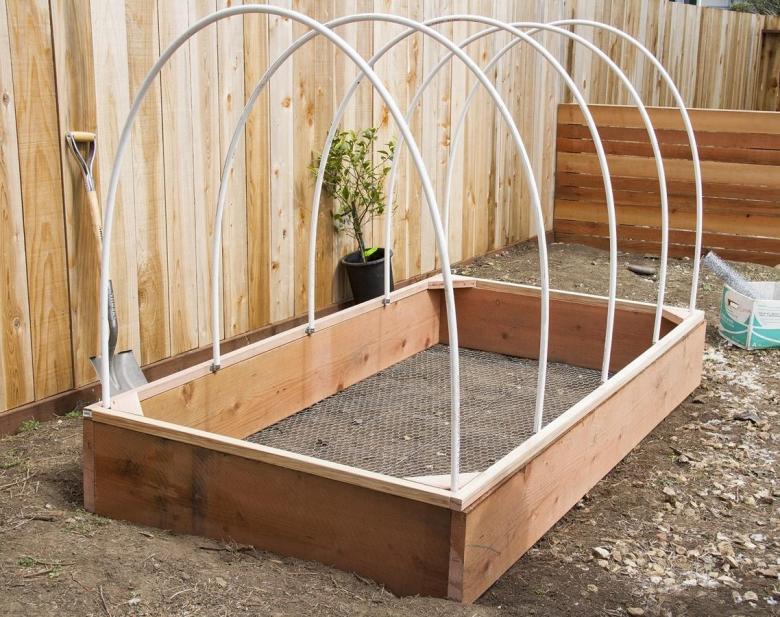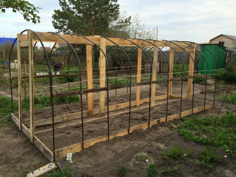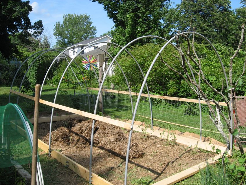 Les arcs sont constitués de fils rigides ou de tuyaux en pvc d'un diamètre de 15 à 25 mm. Les tuyaux sont pliés à la forme souhaitée, puis placés sur des barres de renforcement qui ont été préalablement enfoncées dans le sol. Vous pouvez également fixer les tuyaux à l'aide de supports. Fixez les arcs en fil de fer avec des épingles en U. La construction peut être de n'importe quelle taille.