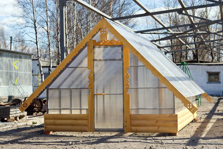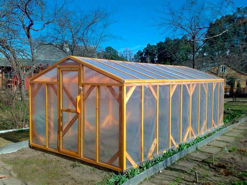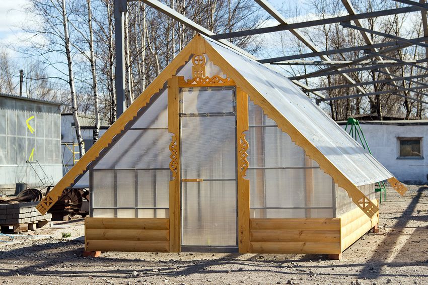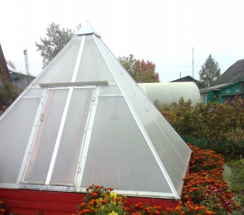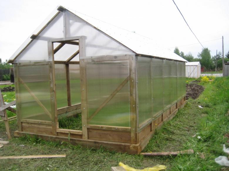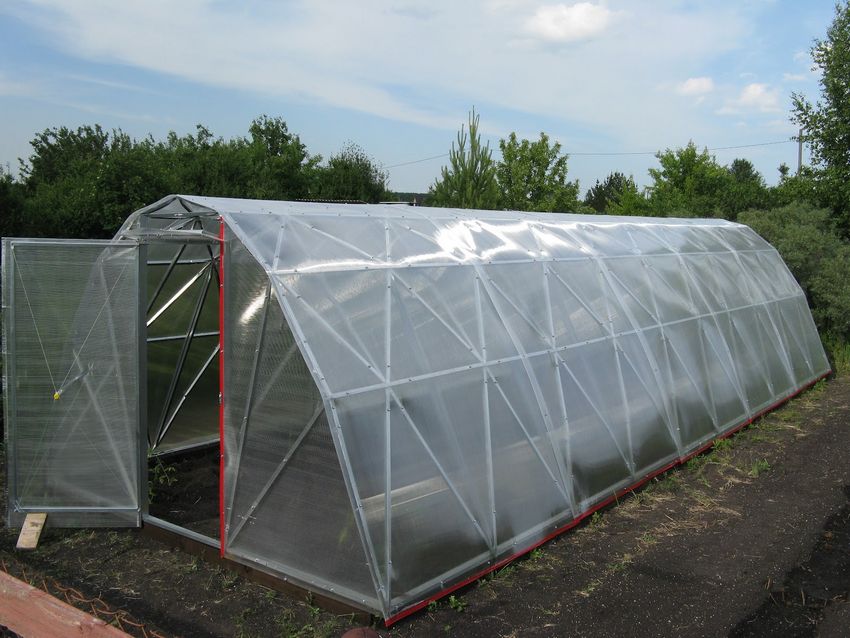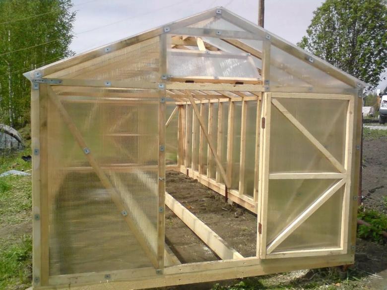 Le polycarbonate est prédécoupé et fixé au cadre, d'abord dans les coins, puis au milieu. Les laitues, les oignons verts, le persil, les carottes, les betteraves, les tomates rabougries et autres cultures basses se sentent le mieux dans une telle serre.
