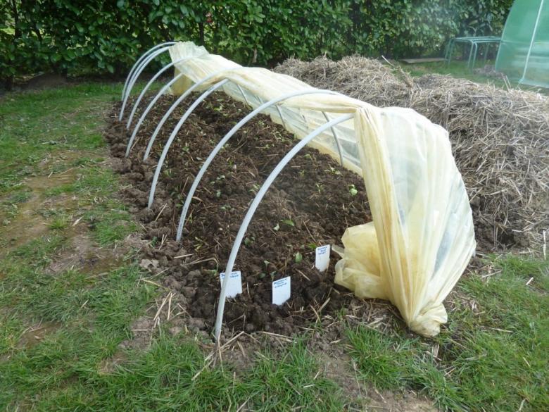 L'une des conceptions les plus simples et peu coûteuses, réchauffe le sol pour les semis, protège les plantes du gel au printemps et en automne. Il est assemblé à partir d'arcs de support, de broches et de matériaux de recouvrement. Le coffrage peut être constitué de planches ou d'une armature de guidage.