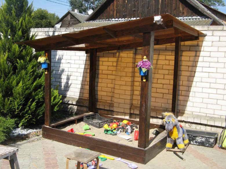 - Pour les espaces extérieurs, il vaut mieux penser à l'avance à un petit baldaquin ou une capote pour protéger la tête du bébé des rayons du soleil. Pour les adultes qui peuvent aussi passer leur temps libre ici (s'occuper de l'enfant), un banc ou un fauteuil peut être aménagé.