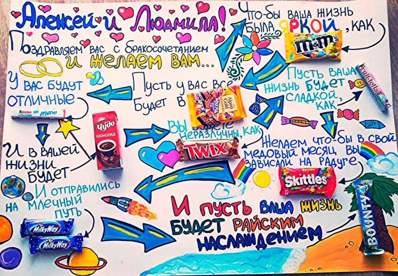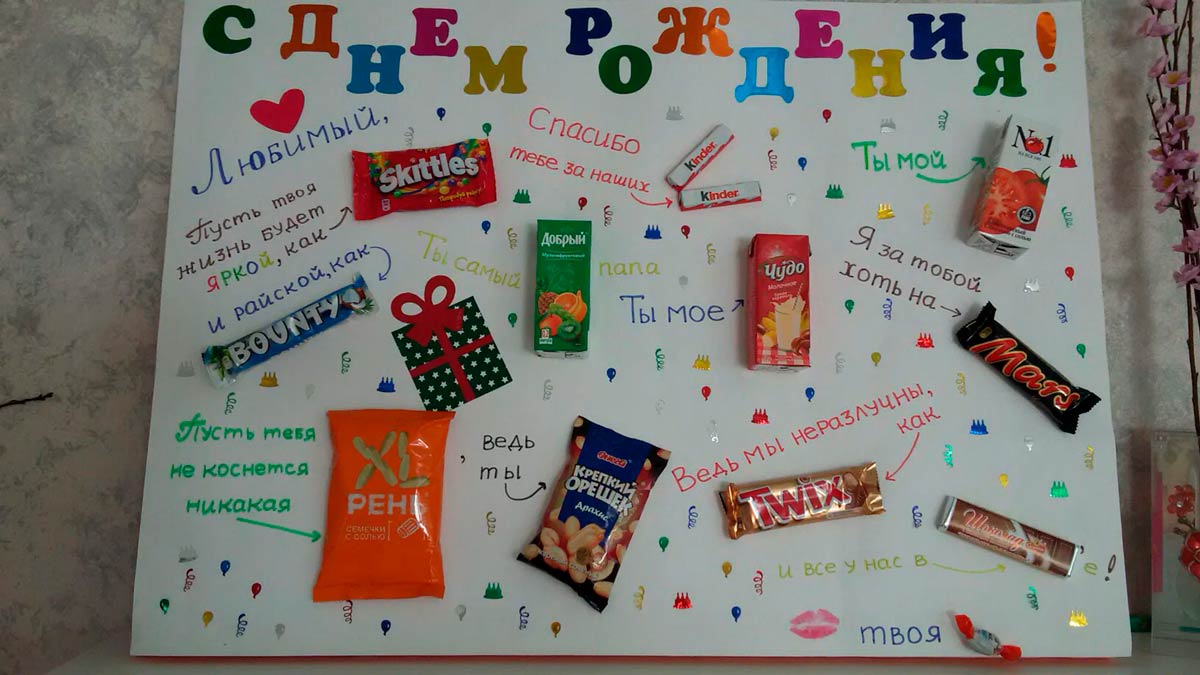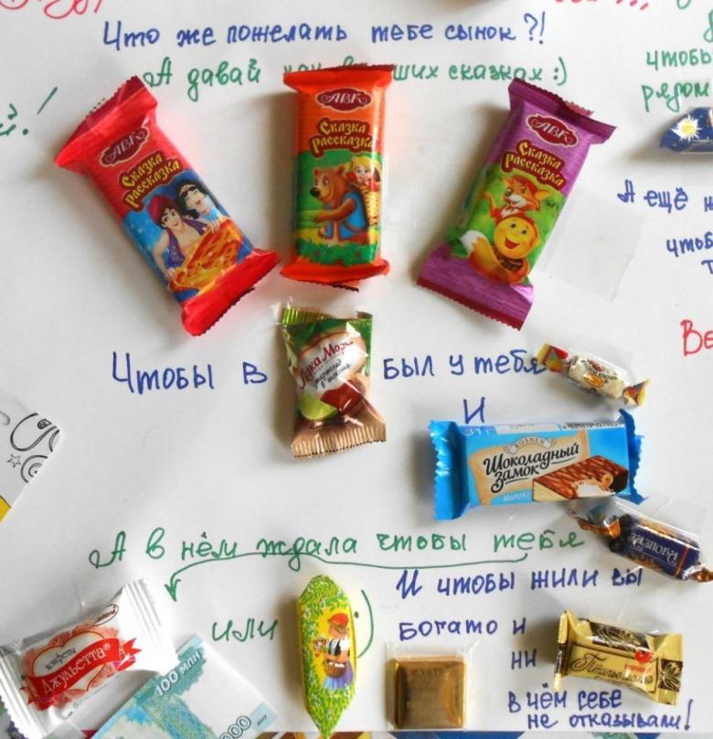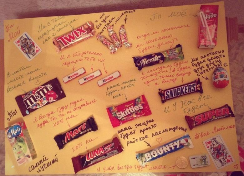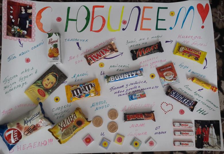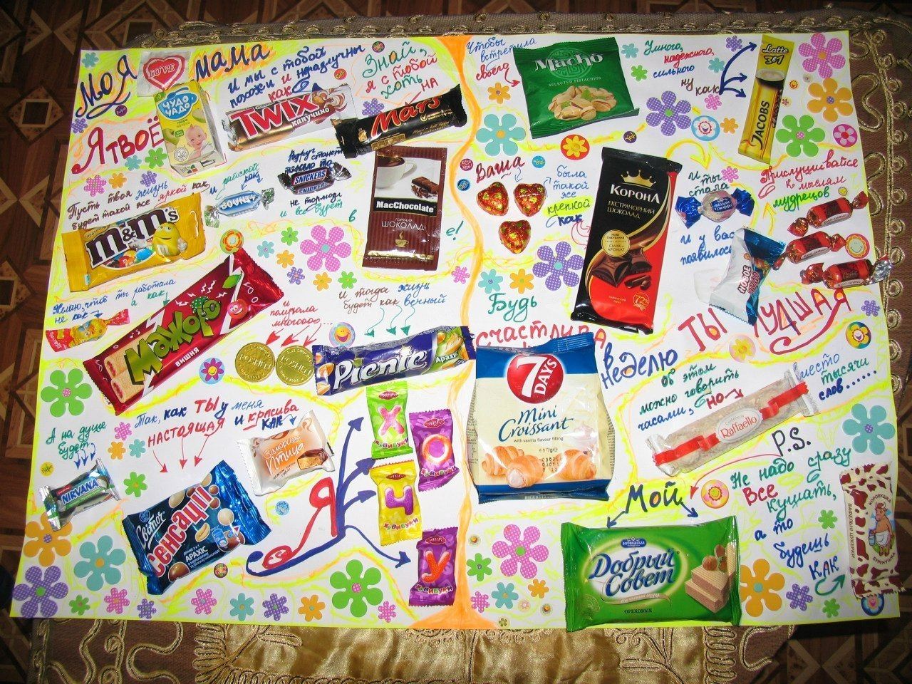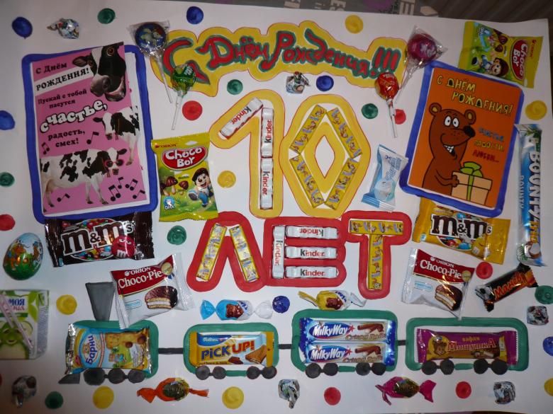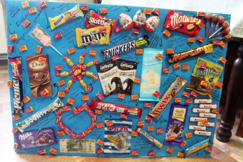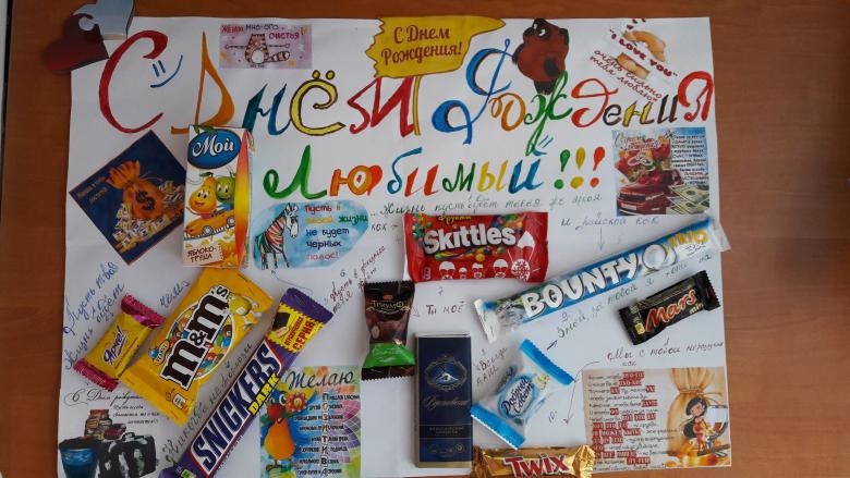 5. Doux. De telles affiches plairont à un enfant ou à une fille. De véritables chocolats et bonbons dans un emballage sont collés sur le papier Watman décoré. Les bonbons sont collés sur le papier à l'aide d'un pistolet chauffant ou d'un ruban adhésif double face. La colle à chaussures ne convient pas : son odeur forte vous enlève toute envie de manger, et de plus, elle est nocive pour la santé par ses émanations.