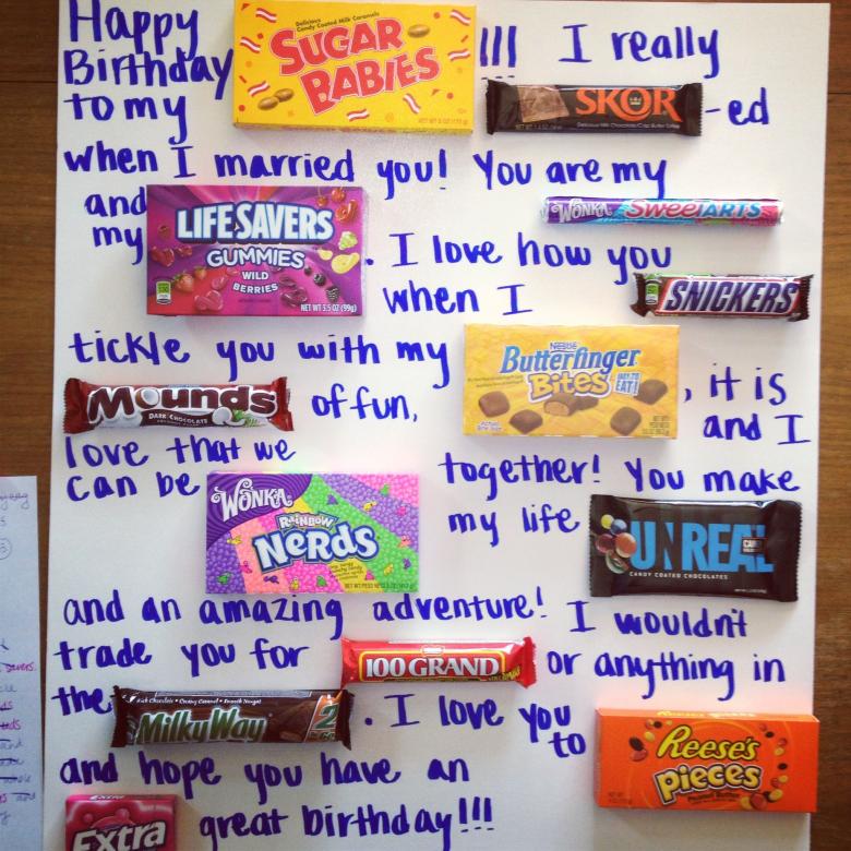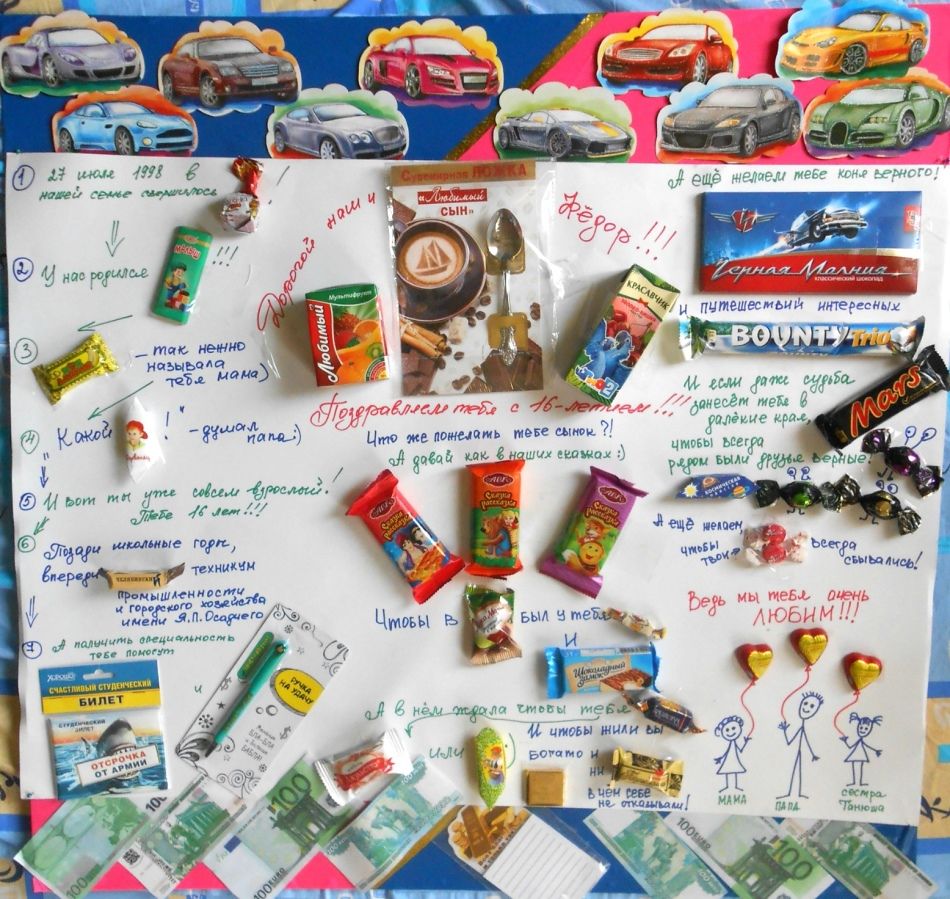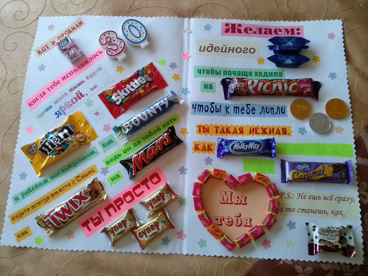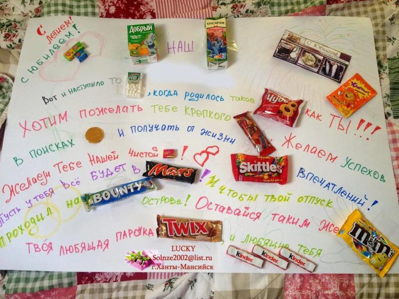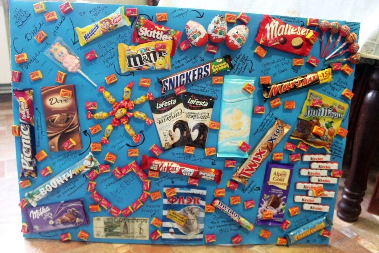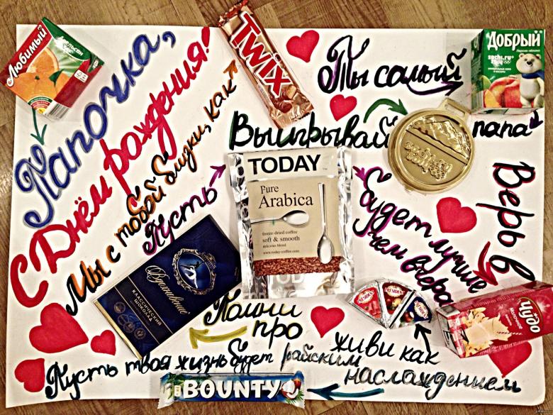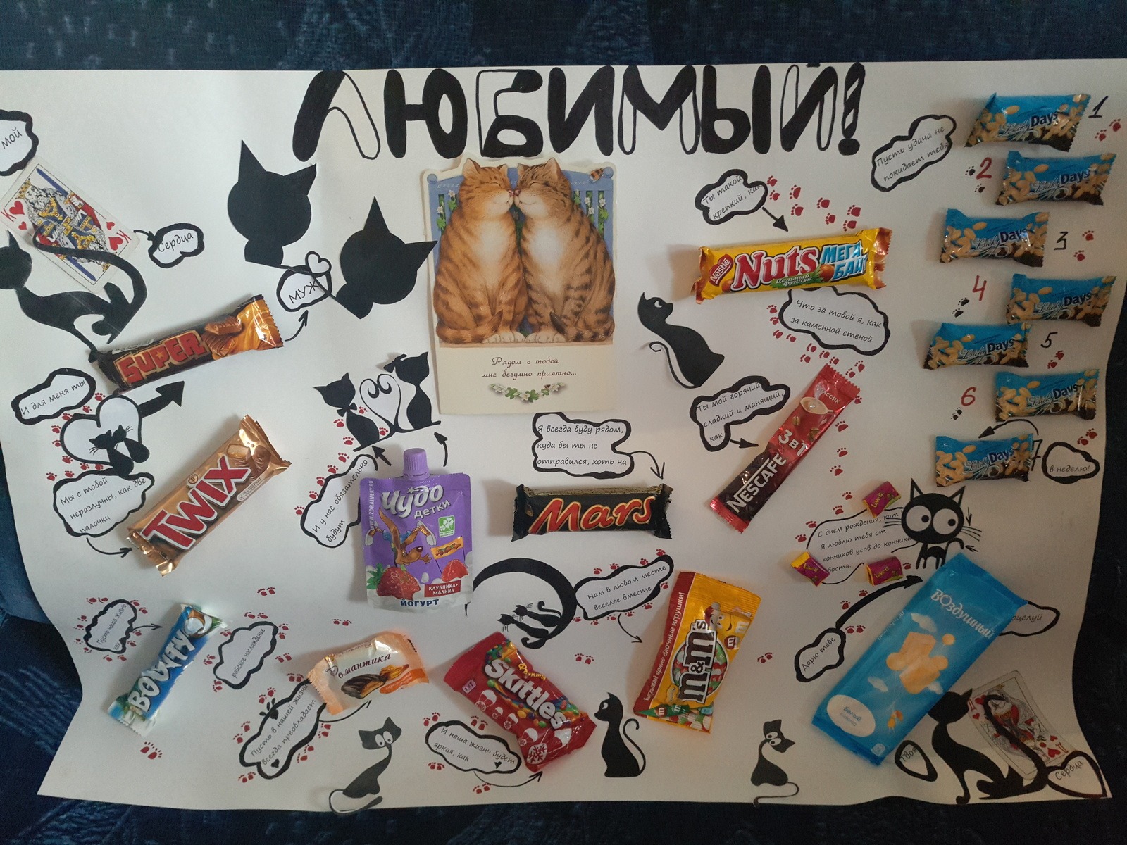 5. Doux. De telles affiches plairont à un enfant ou à une fille. De véritables chocolats et bonbons dans un emballage sont collés sur le papier Watman décoré. Les bonbons sont collés sur le papier à l'aide d'un pistolet chauffant ou d'un ruban adhésif double face. La colle à chaussures ne convient pas : son odeur forte vous enlève toute envie de manger, et de plus, elle est nocive pour la santé par ses émanations.