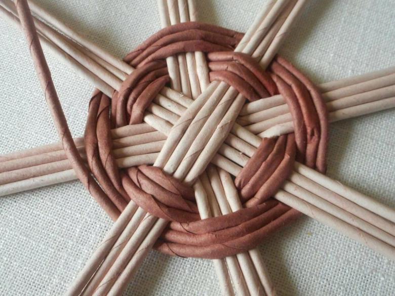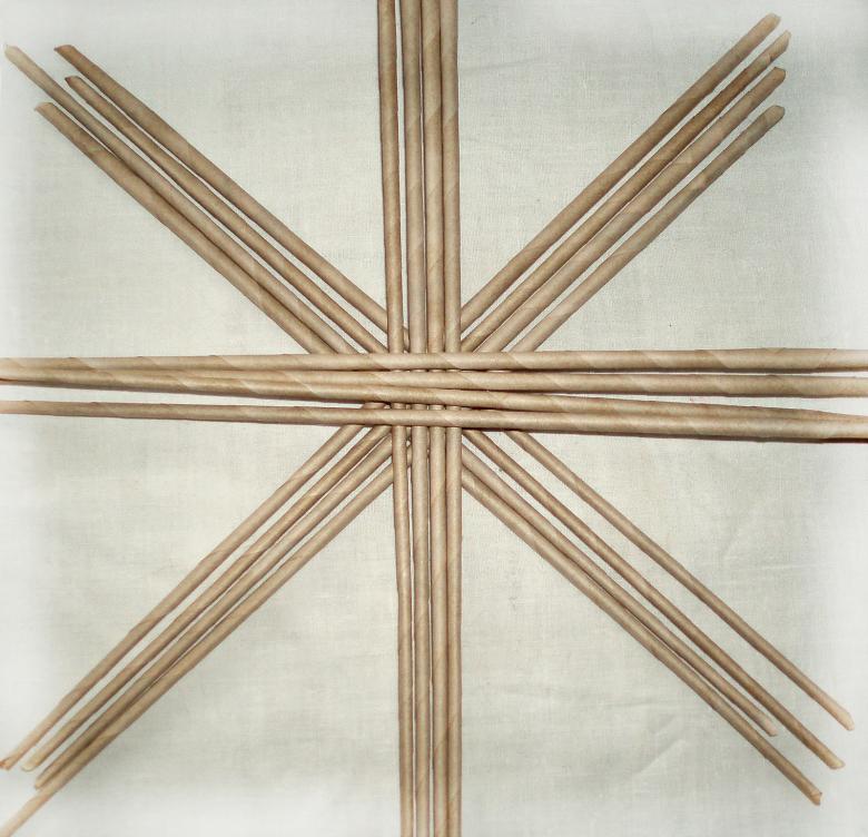 Il est également facile de faire quatre rangées de pailles en nombre égal et en forme de croix. Pour créer un fond plat, la "croix" est roulée avec un rouleau à pâtisserie. Ce milieu est ensuite tressé selon un modèle de tissage plat, amenant le diamètre du fond à la bonne taille.