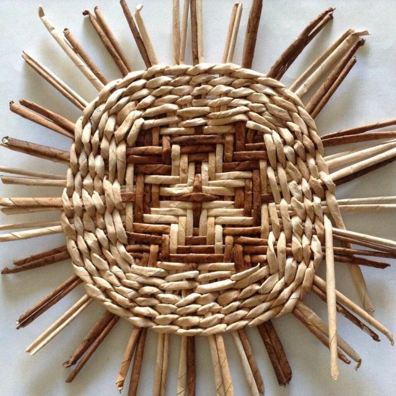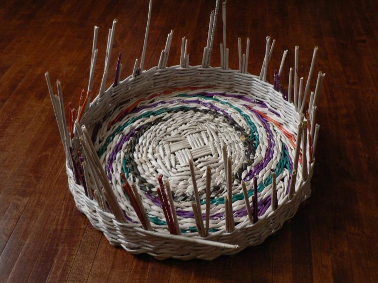 A partir d'une tige peinte, il est facile de tisser un vase insolite, un cachet, un plateau ou une assiette décorative.
