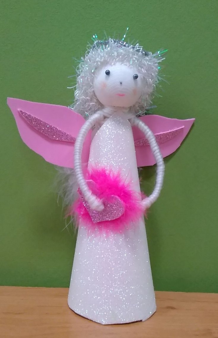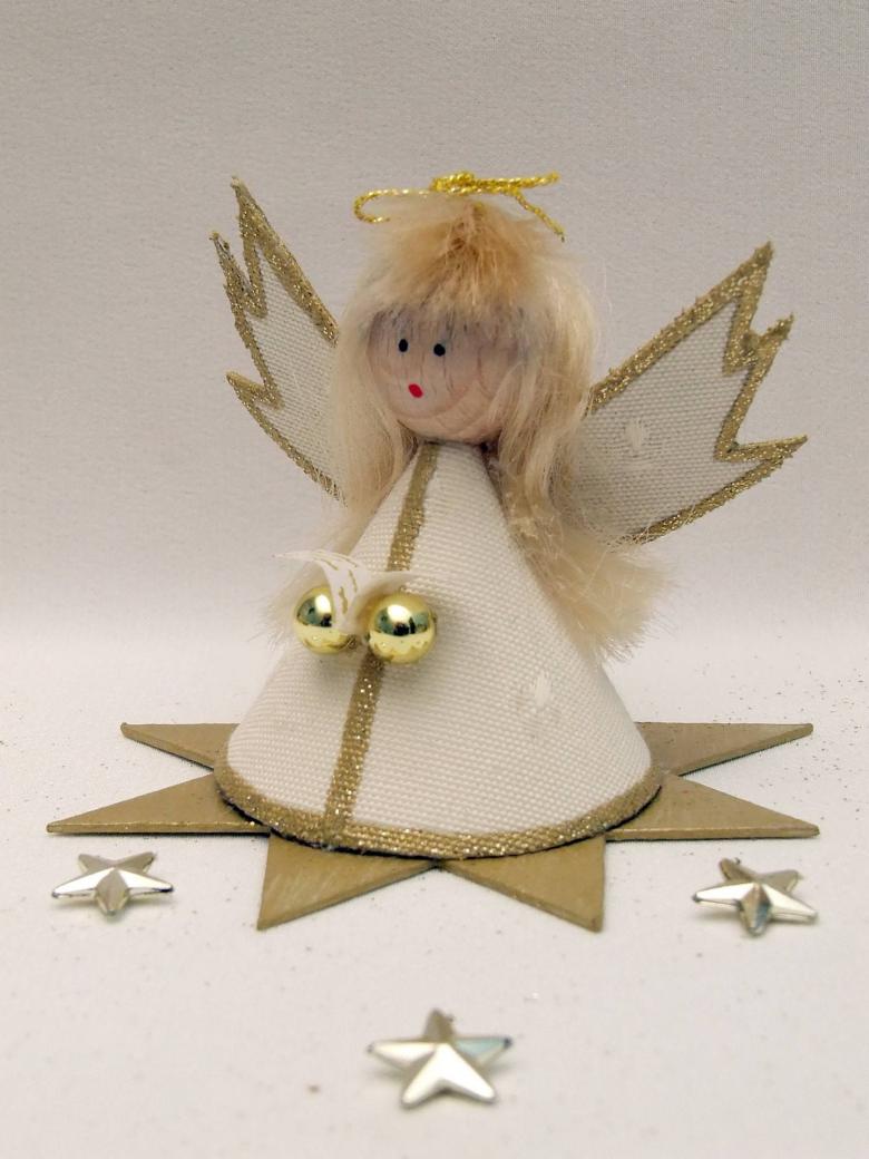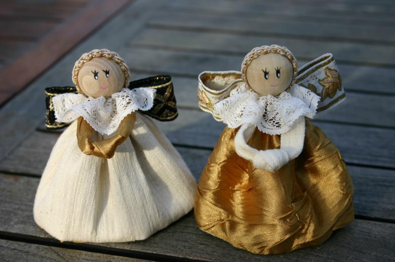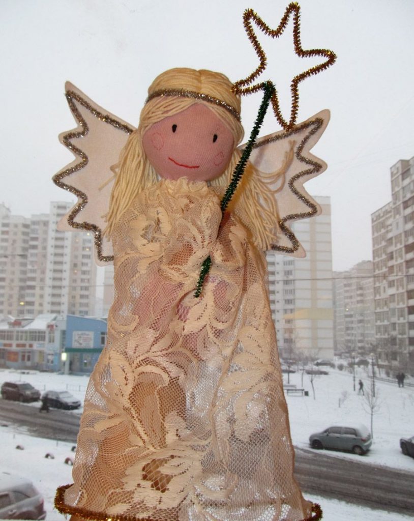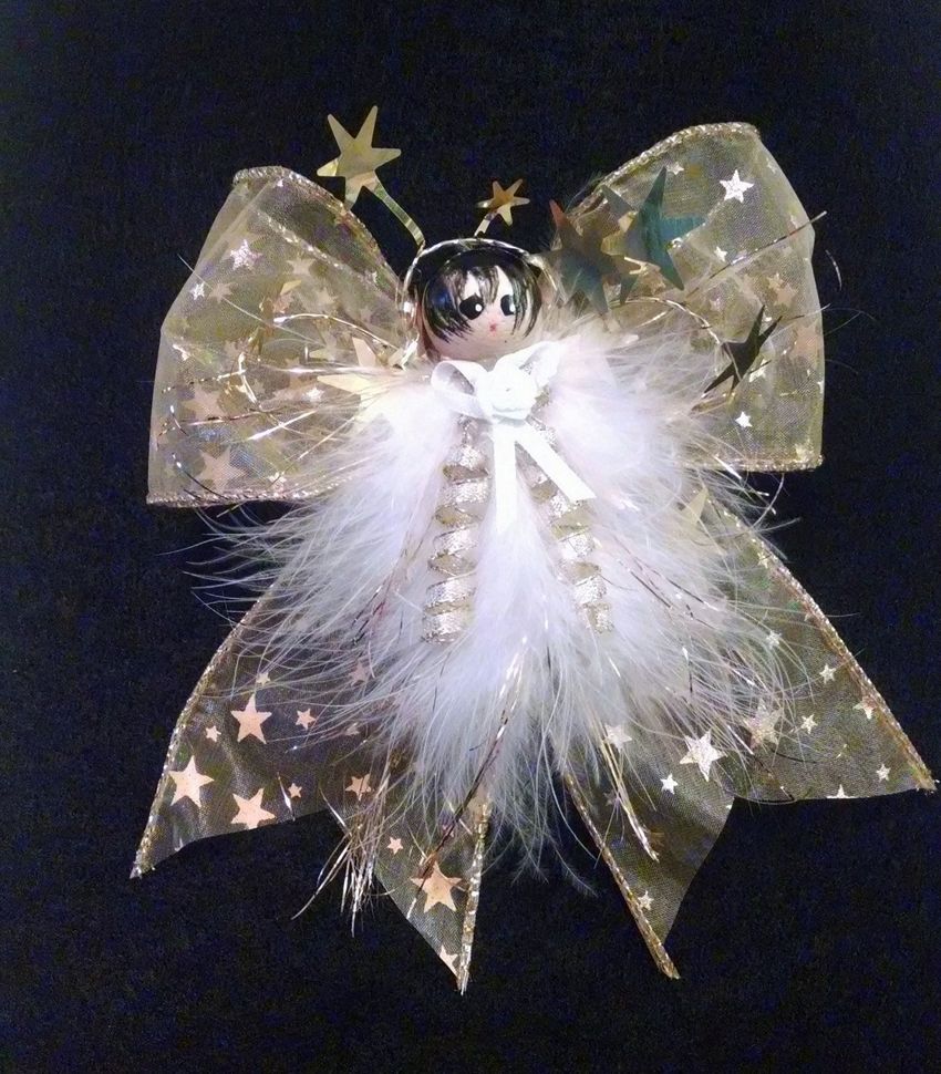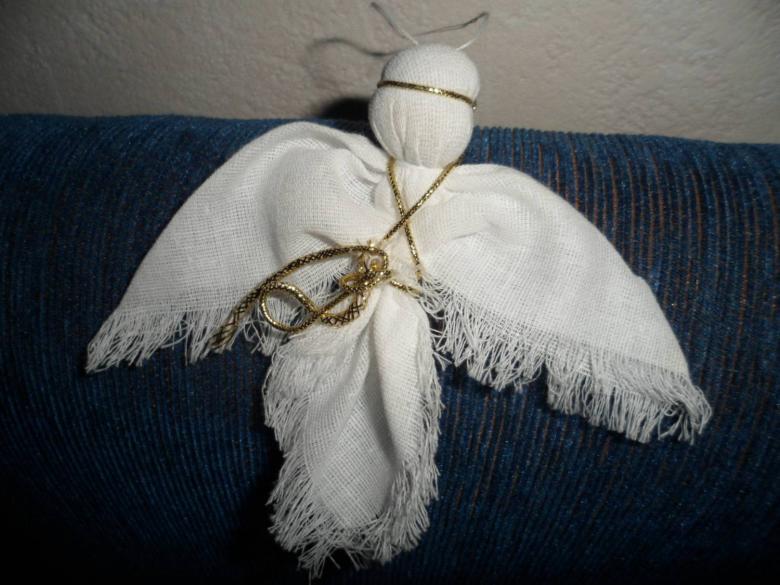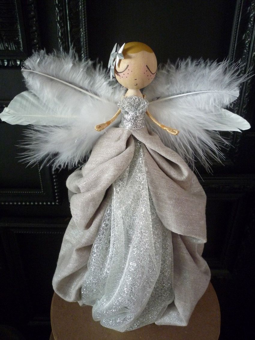 - Les restes de tissu ou d'autres pièces de tissu sont utilisés pour créer les ailes d'un ange, un vêtement sous forme de jupe ou de robe longue au choix de l'auteur. Une bande de fil d'argent est ajoutée pour couvrir le point de fixation inesthétique. Un halo de tissu argenté est ajouté à la tête.