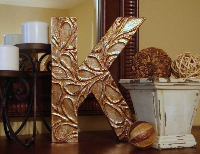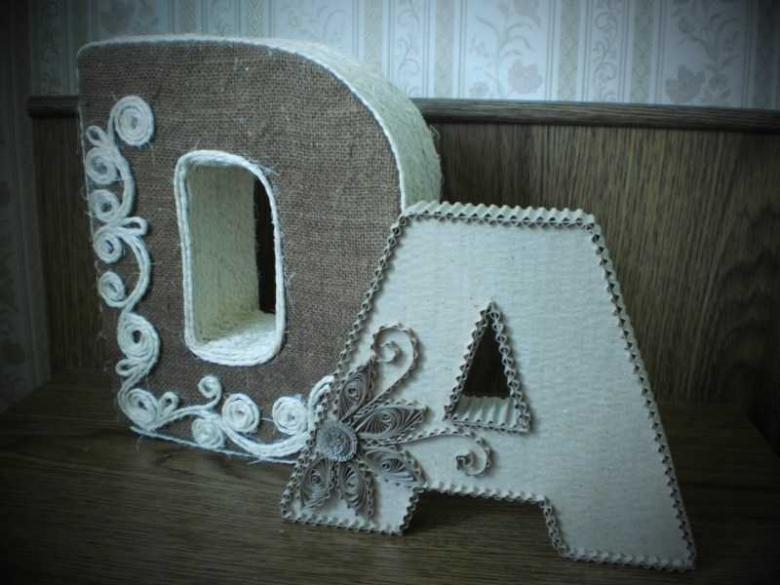 - Lettres artisanales en bois. Ce type d'artisanat ne convient pas à tout le monde, mais seulement à ceux qui sont familiers avec le travail du bois. La création d'une lettre prendra beaucoup de temps, mais cela en vaut la peine - l'artisanat ressemblera à un chef-d'œuvre et aura fière allure dans l'intérieur.
