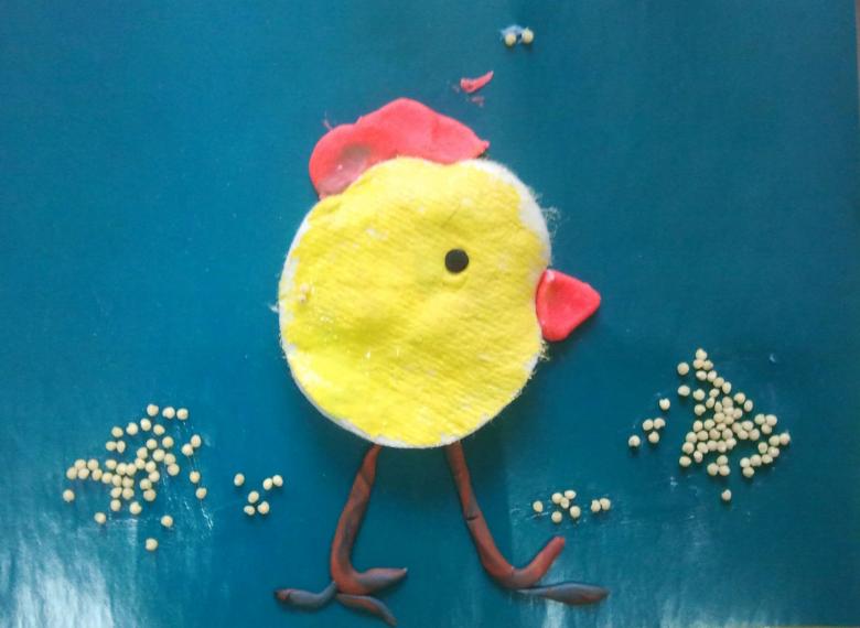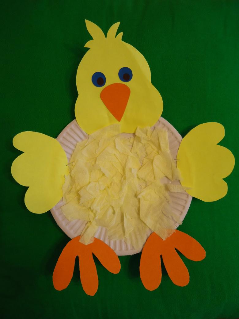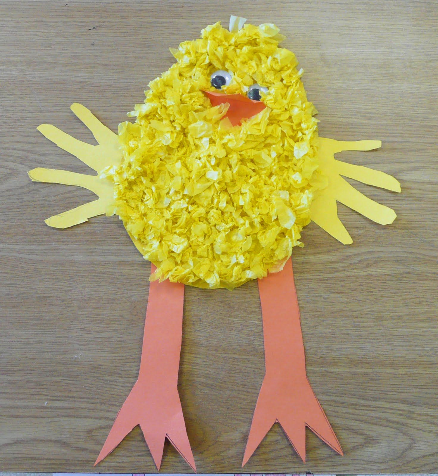 Vous pouvez également utiliser la technique de l'applique à déchirer. Un adulte pré-colle une figurine de poulet, et les enfants déchirent de petites bandes de papier en morceaux et les collent sur la base.