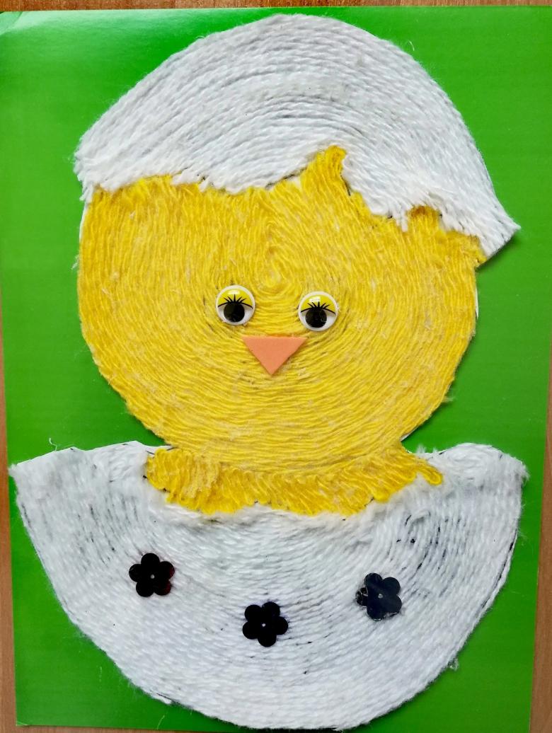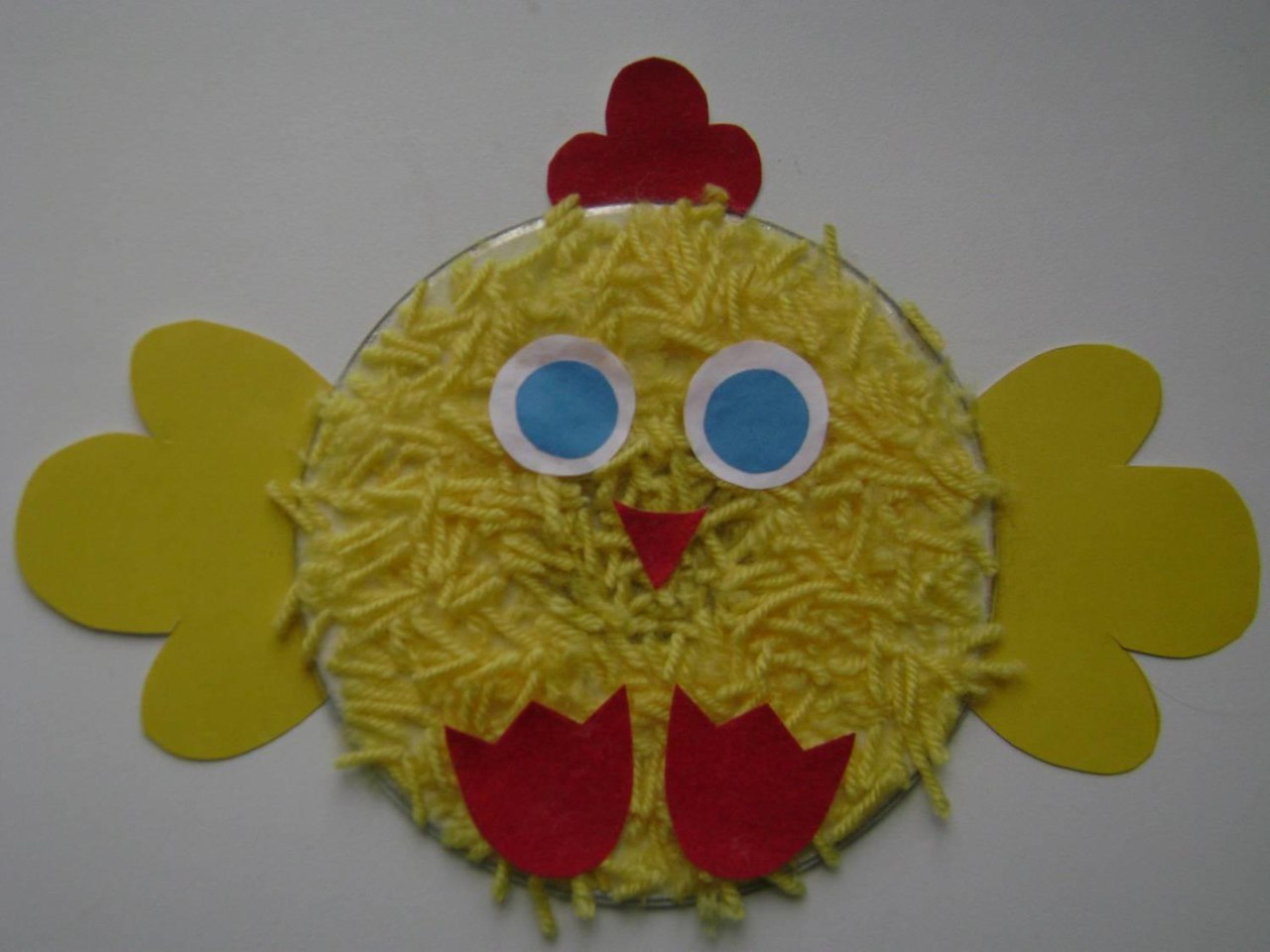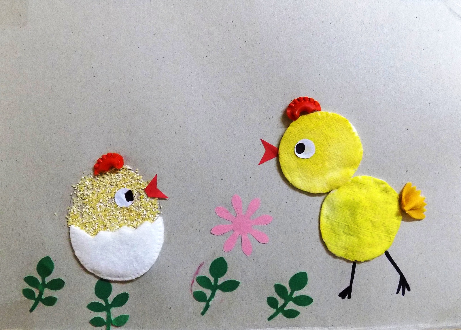 On peut les placer (sans les boucles) sur une feuille de papier vert et les coller. Ajoutez différents grains en enduisant la feuille de colle et en y saupoudrant les aliments. Le résultat est une applique originale - des poussins sur l'herbe.Attention est offert un artisanat assez facile qui ne nécessite pas de temps supplémentaire, une certaine compétence et des matériaux. Avec les objets jetables les plus simples, vous pouvez créer une activité artisanale amusante - une merveilleuse image d'un poussin dans un œuf.