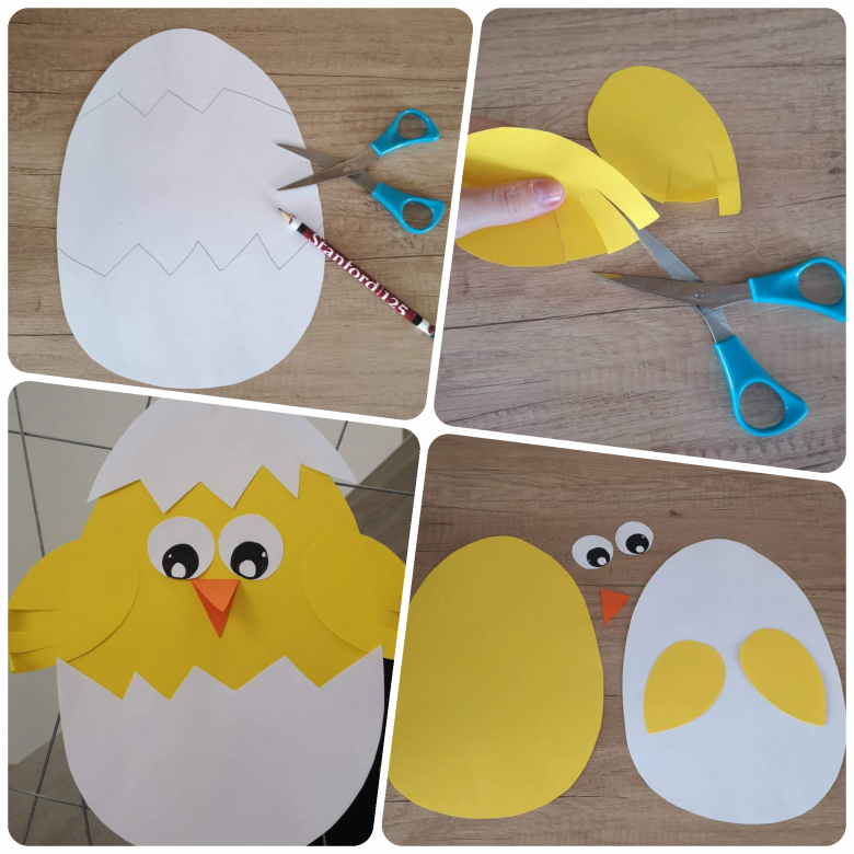 - Découpez une coquille, un bec et des pattes (triangles) dans le cercle rouge et collez-les sur le poussin jaune (côté arrière).