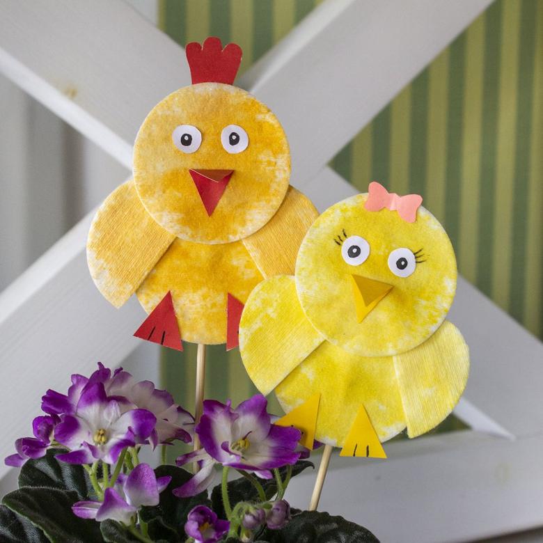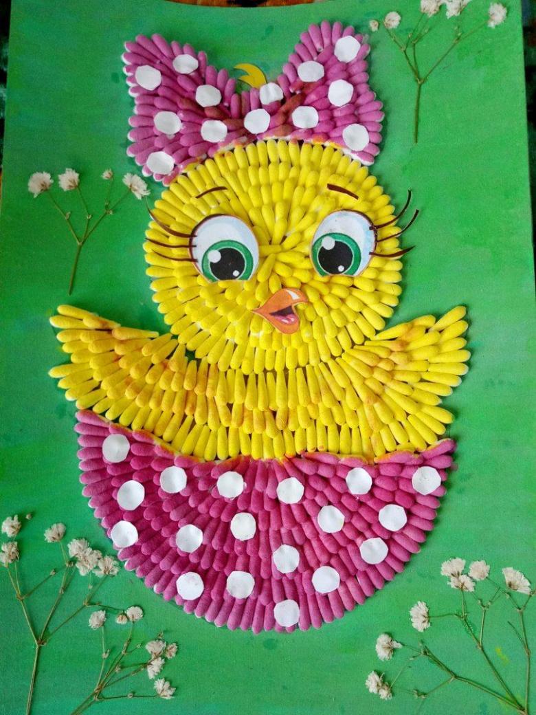 Votre enfant adorera faire un intéressant bricolage de "poulet" à partir de disques de coton avec votre maman. Cette option est assez simple et accessible même aux plus petits.